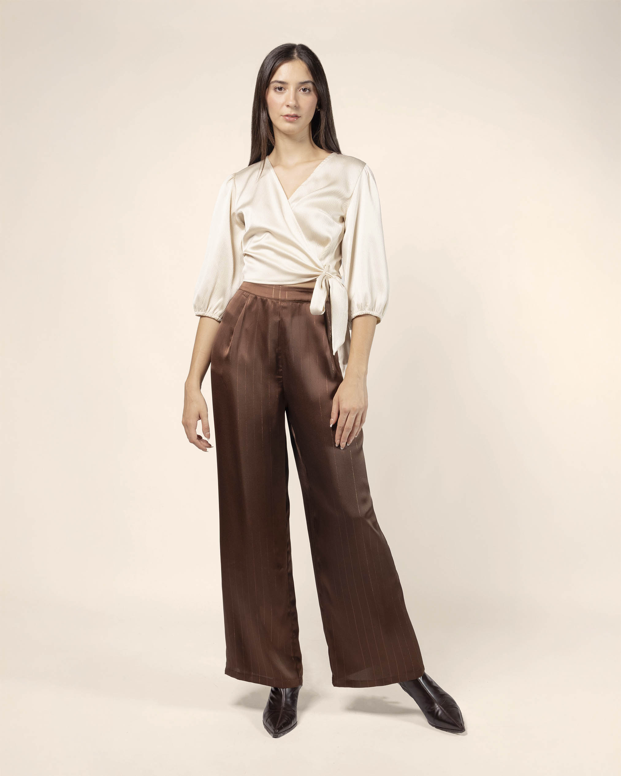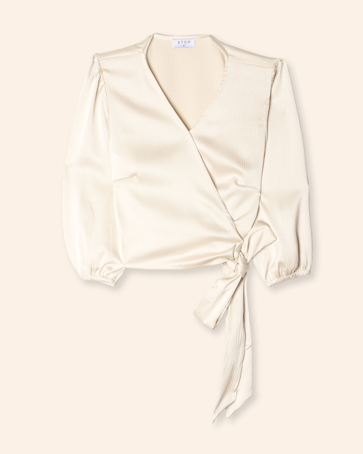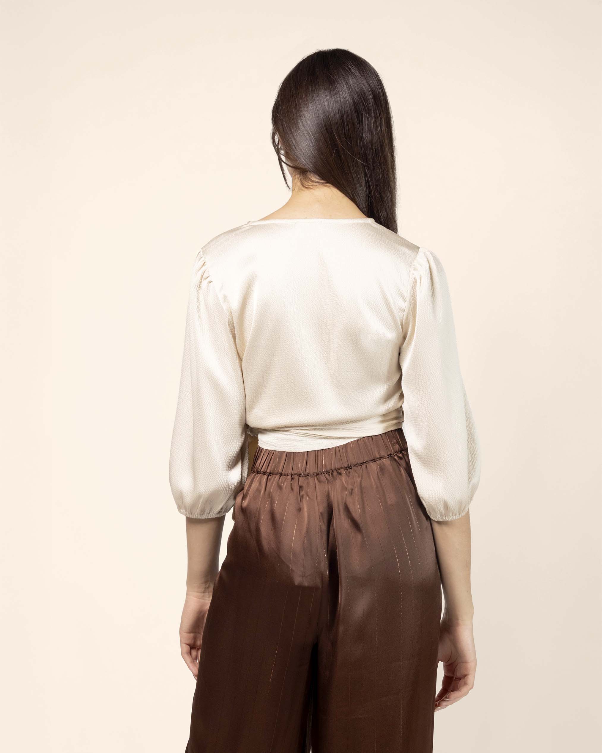 Blusa con cruce y amarre en costado, con manga 3/4, tela con textura