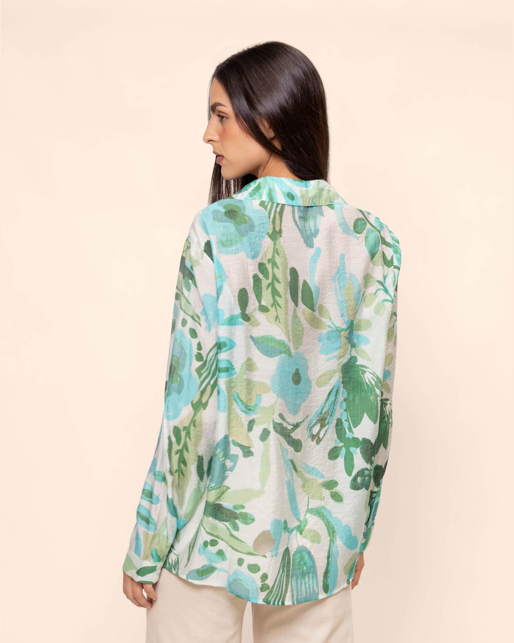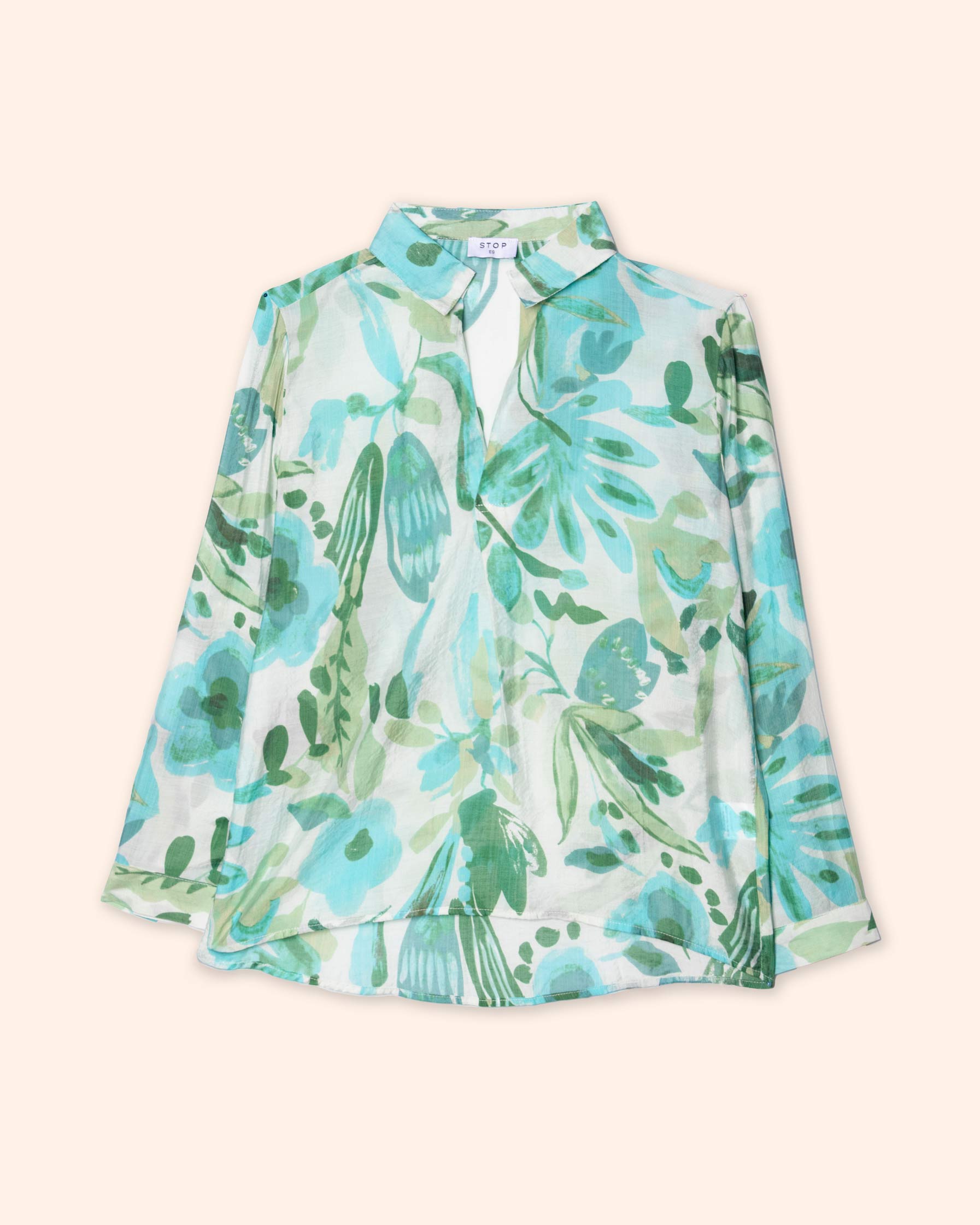 Blusa estampada, cuello en V con aletilla, manga larga con tela ligera