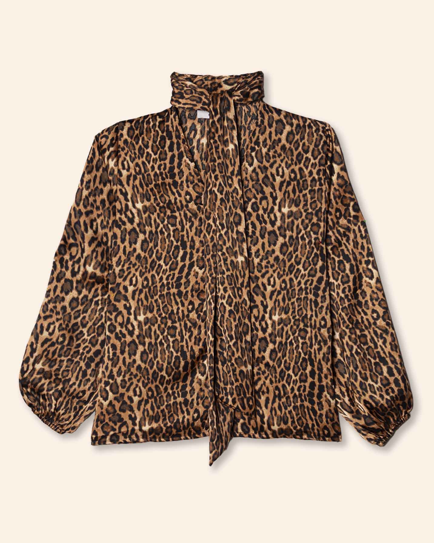 Blusa manga larga, cuello V con lazo, estampada satinada