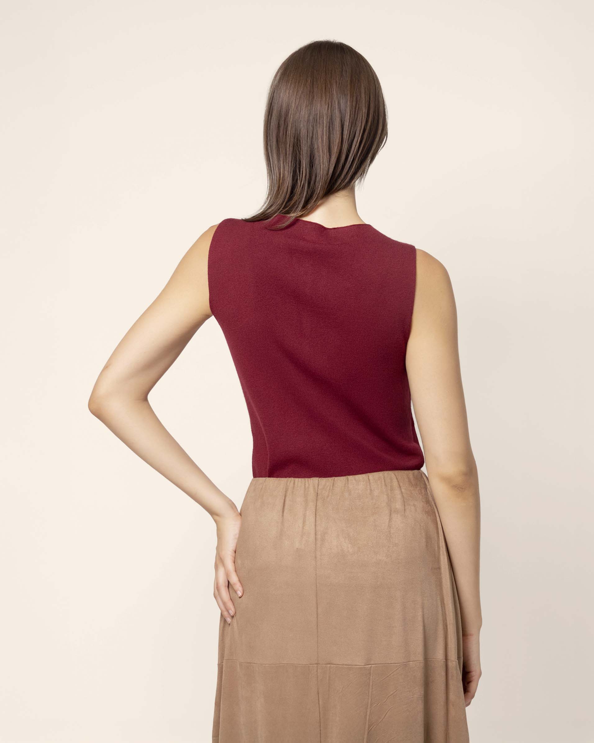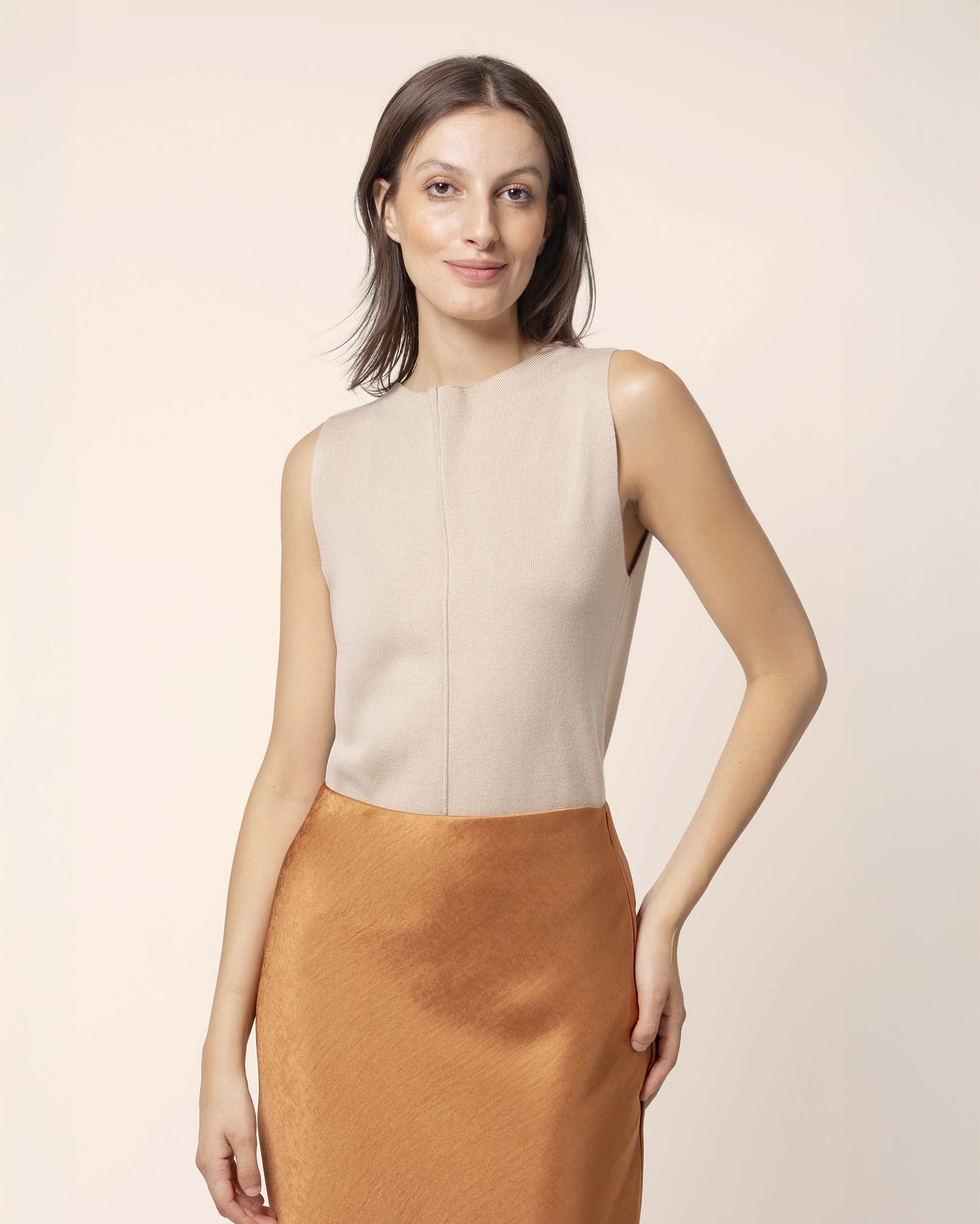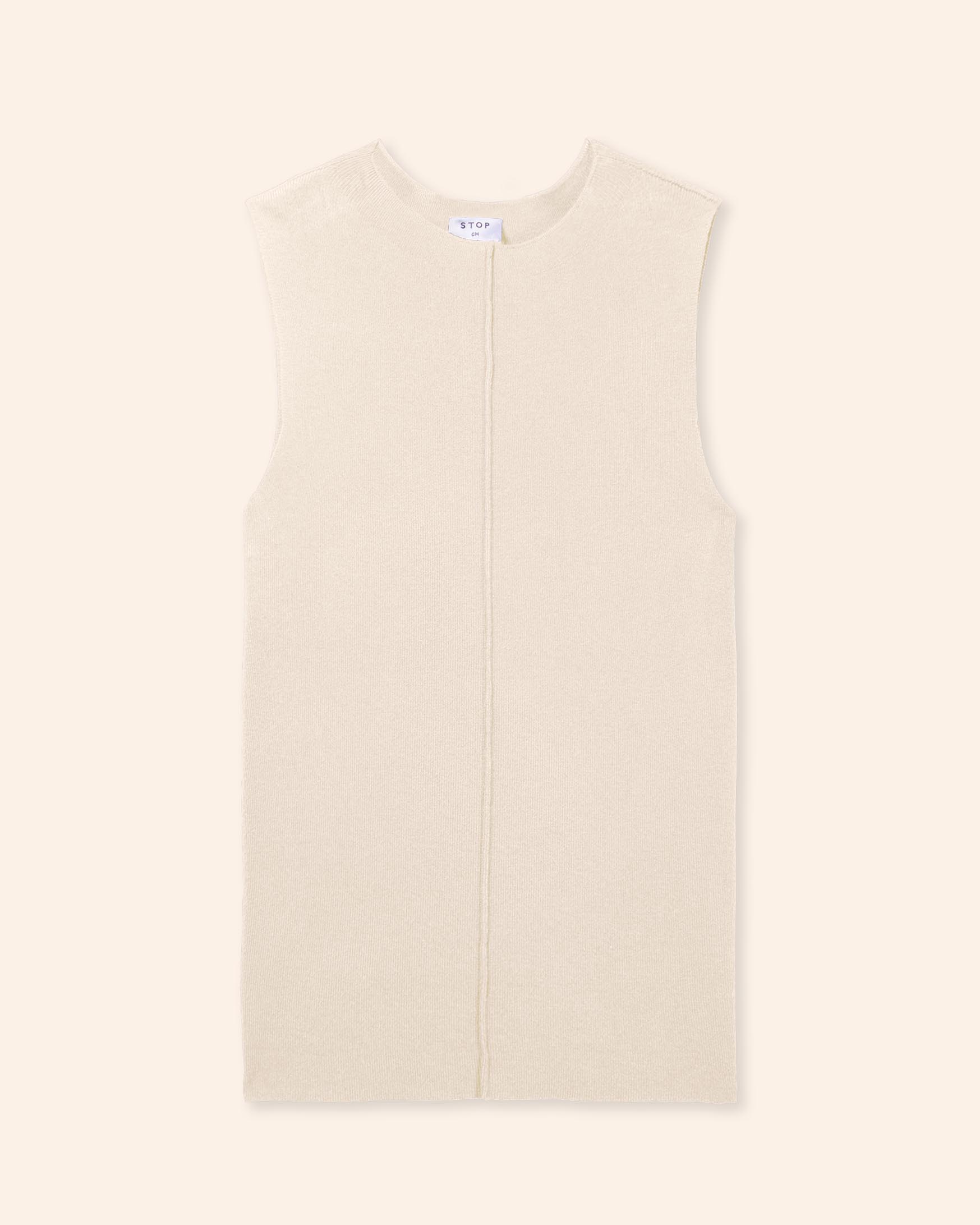 Blusa de punto, con línea al frente, sin mangas, cuello ojal