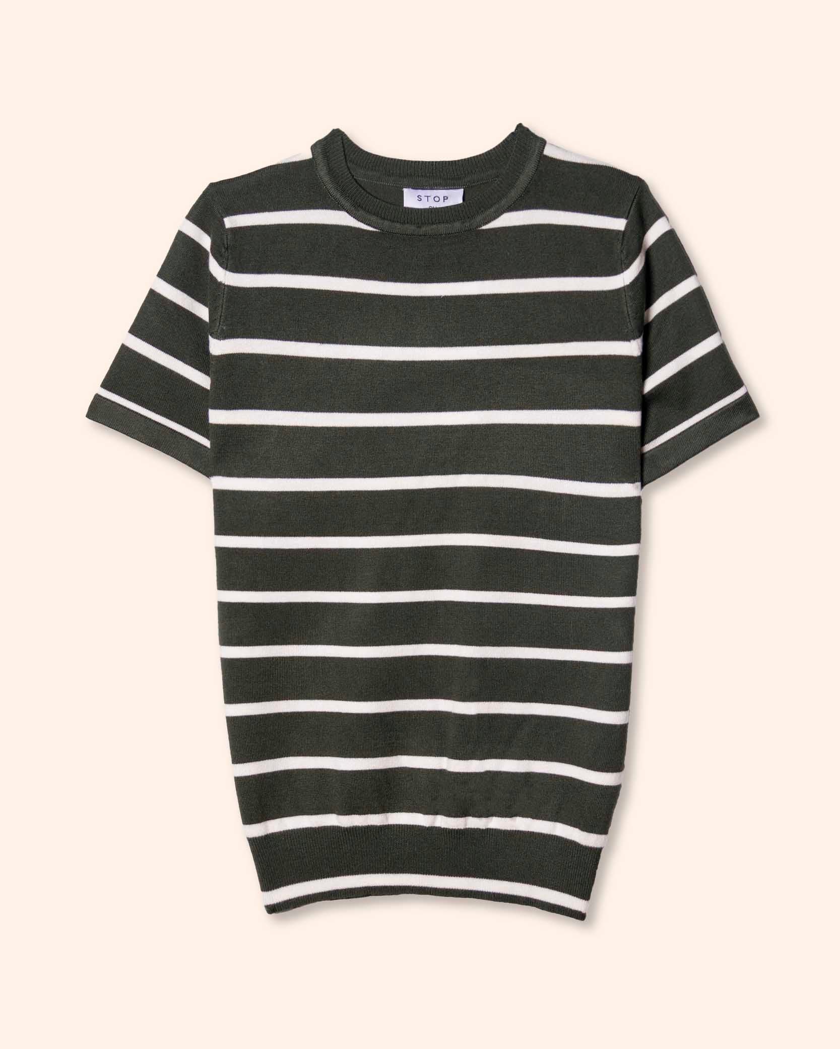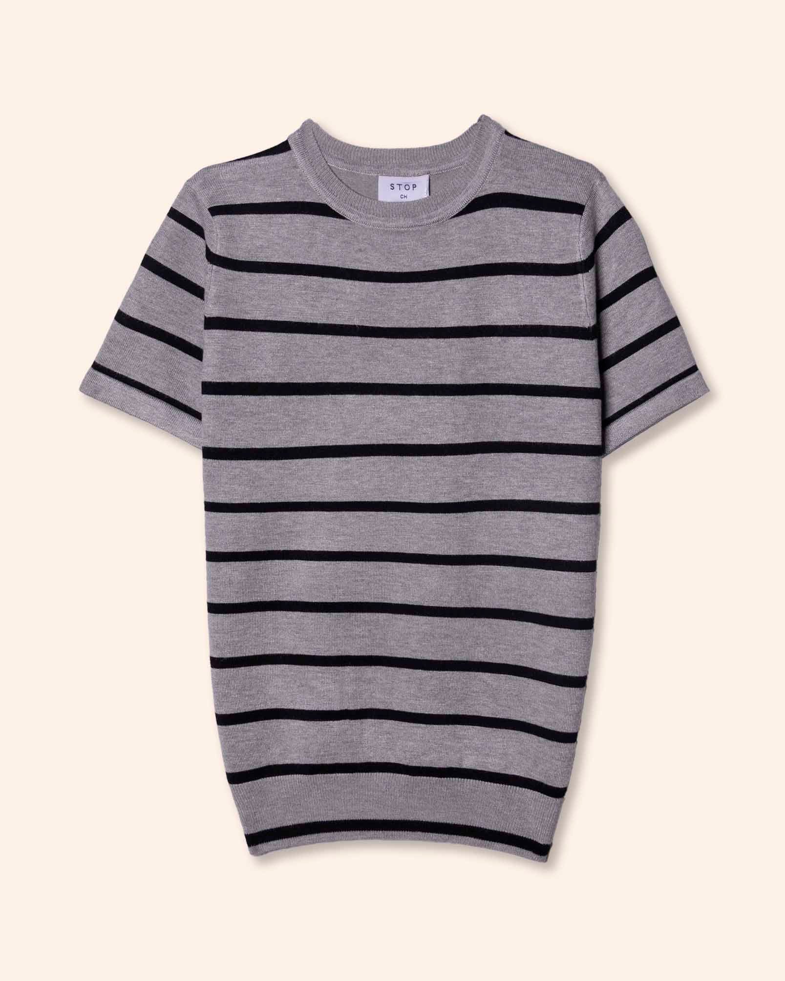 Blusa tejida a rayas, con cuello redondo, manga corta
