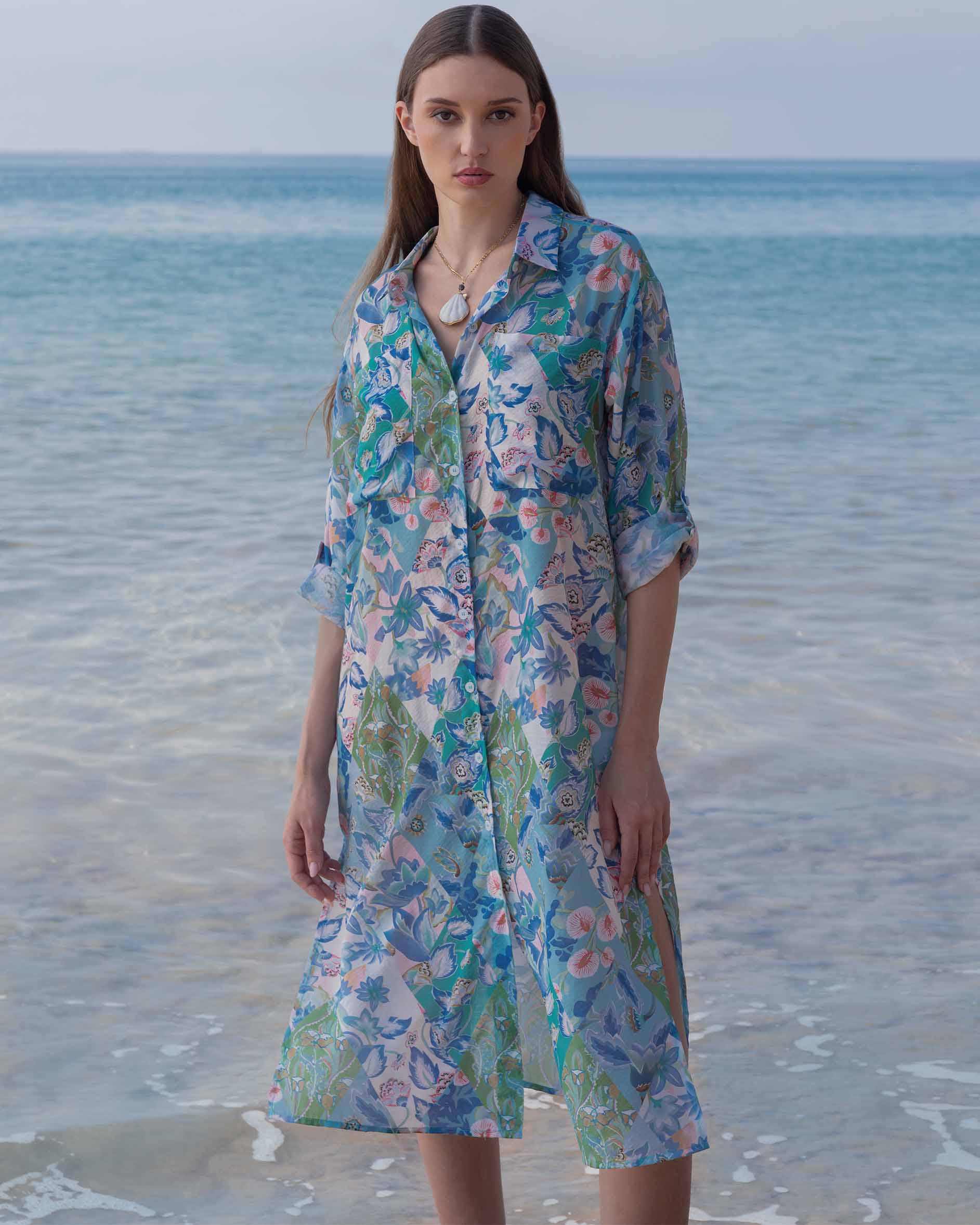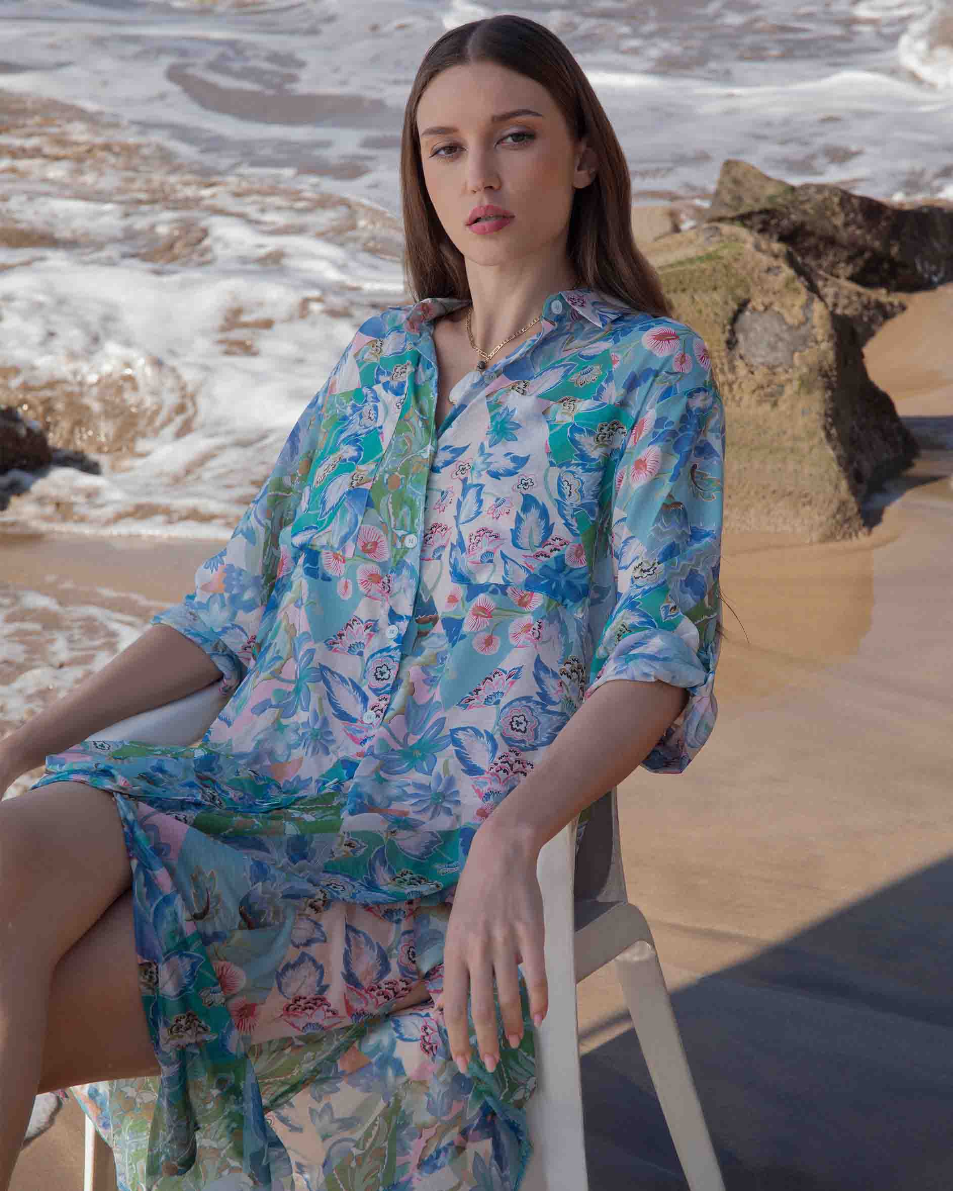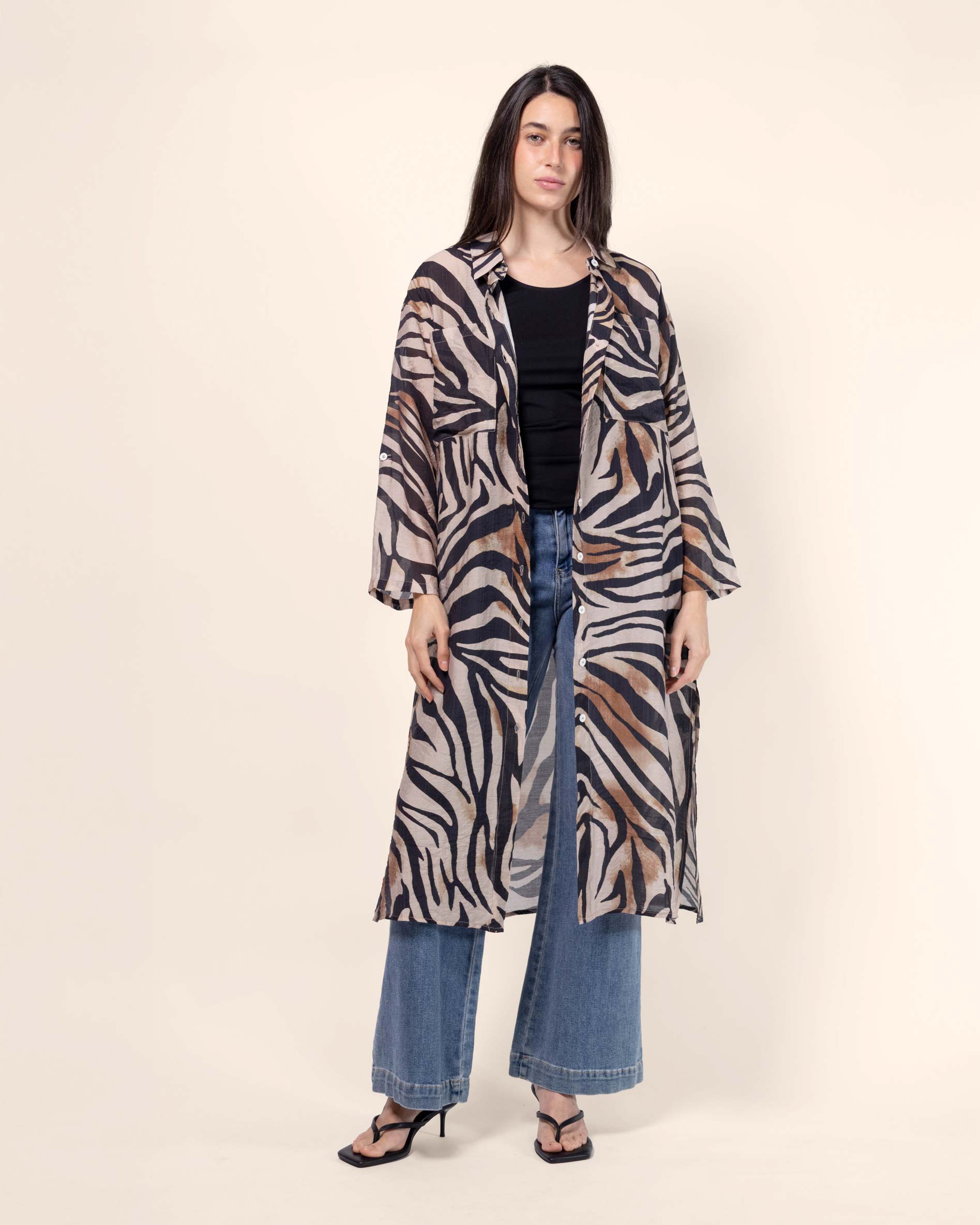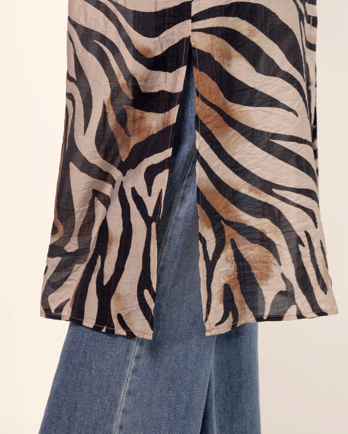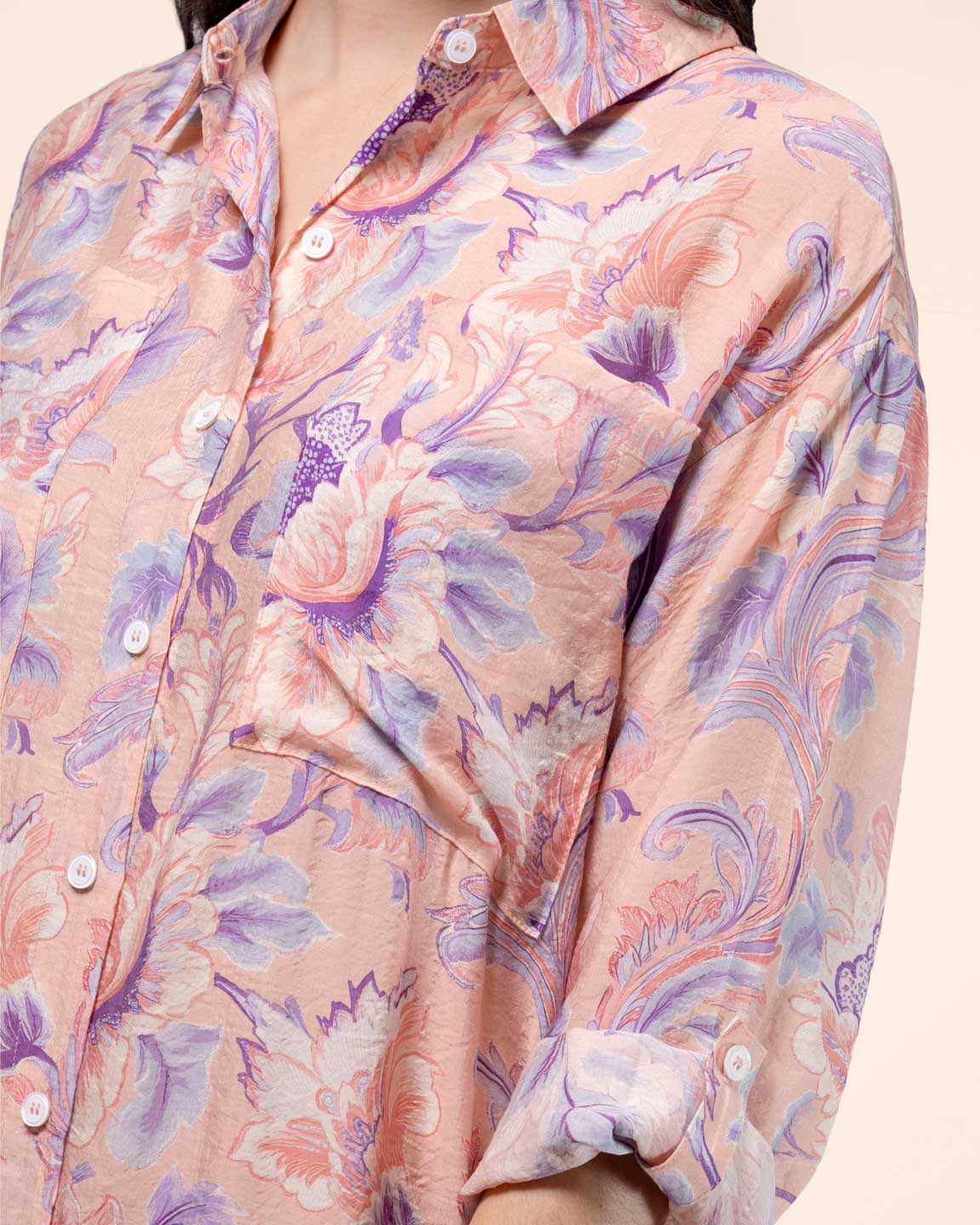 Blusón camisero, manga larga, con roll up y bolsas, tela ligera estampada