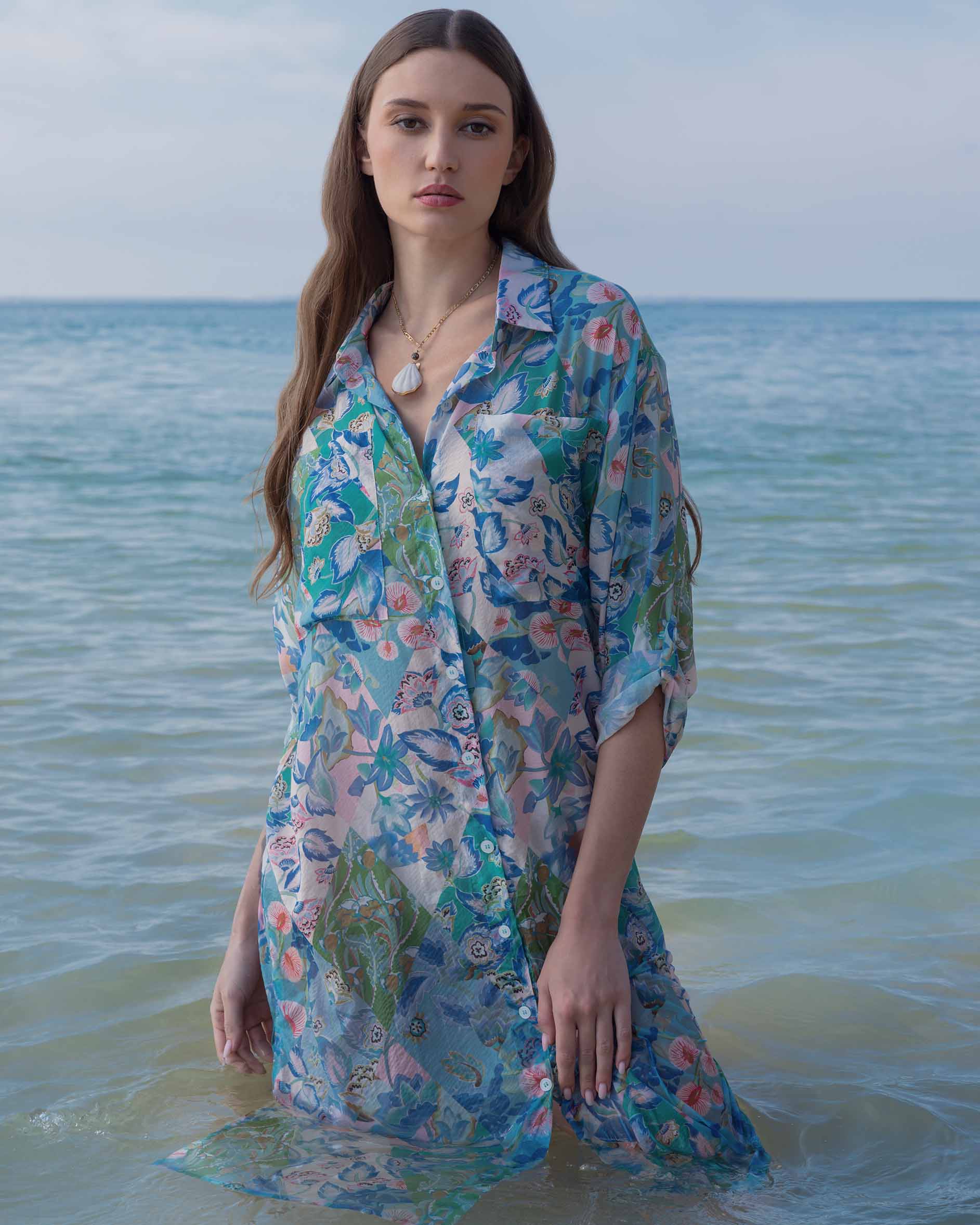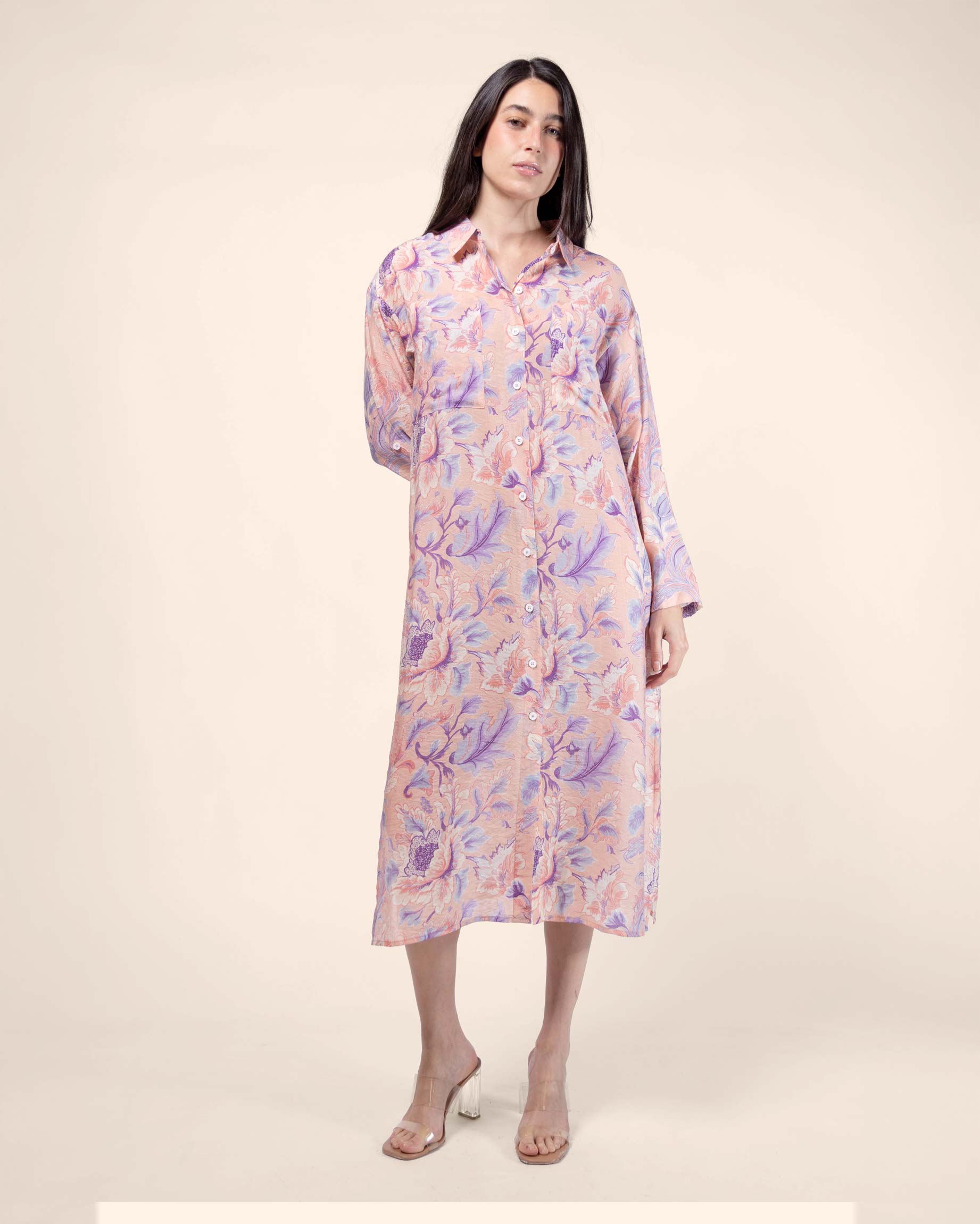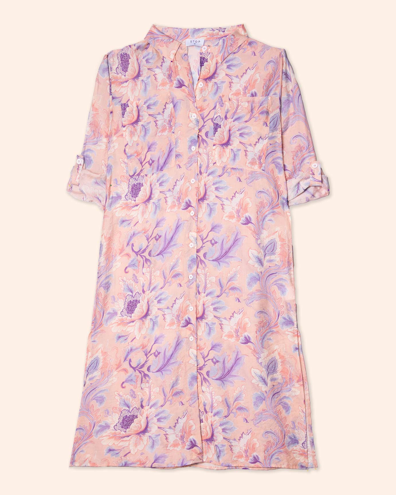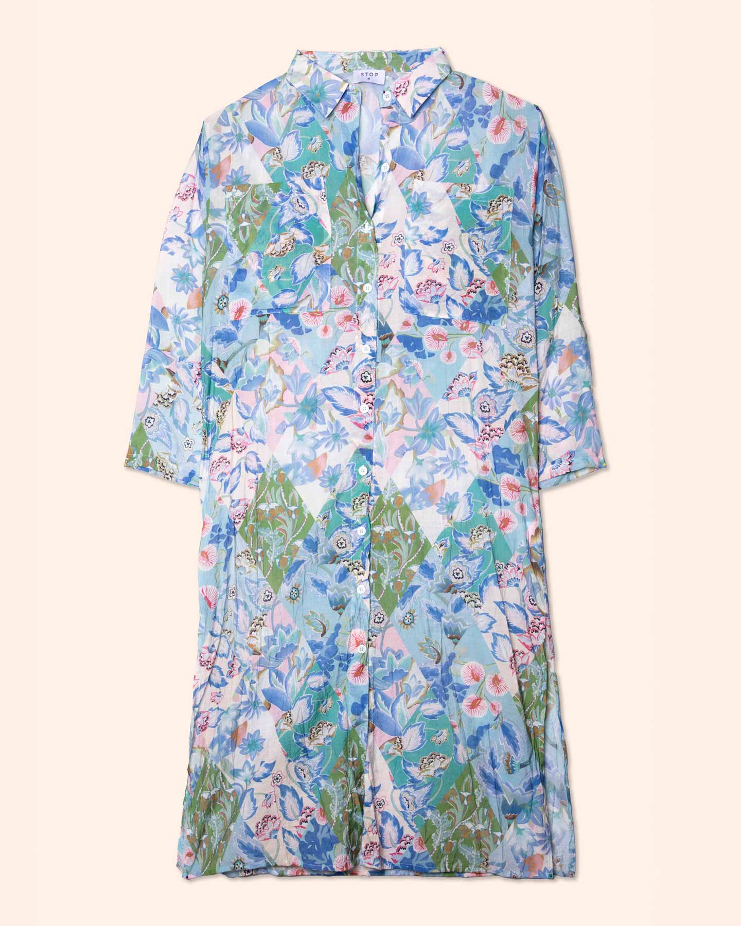 Blusón camisero, manga larga, con roll up y bolsas, tela ligera estampada