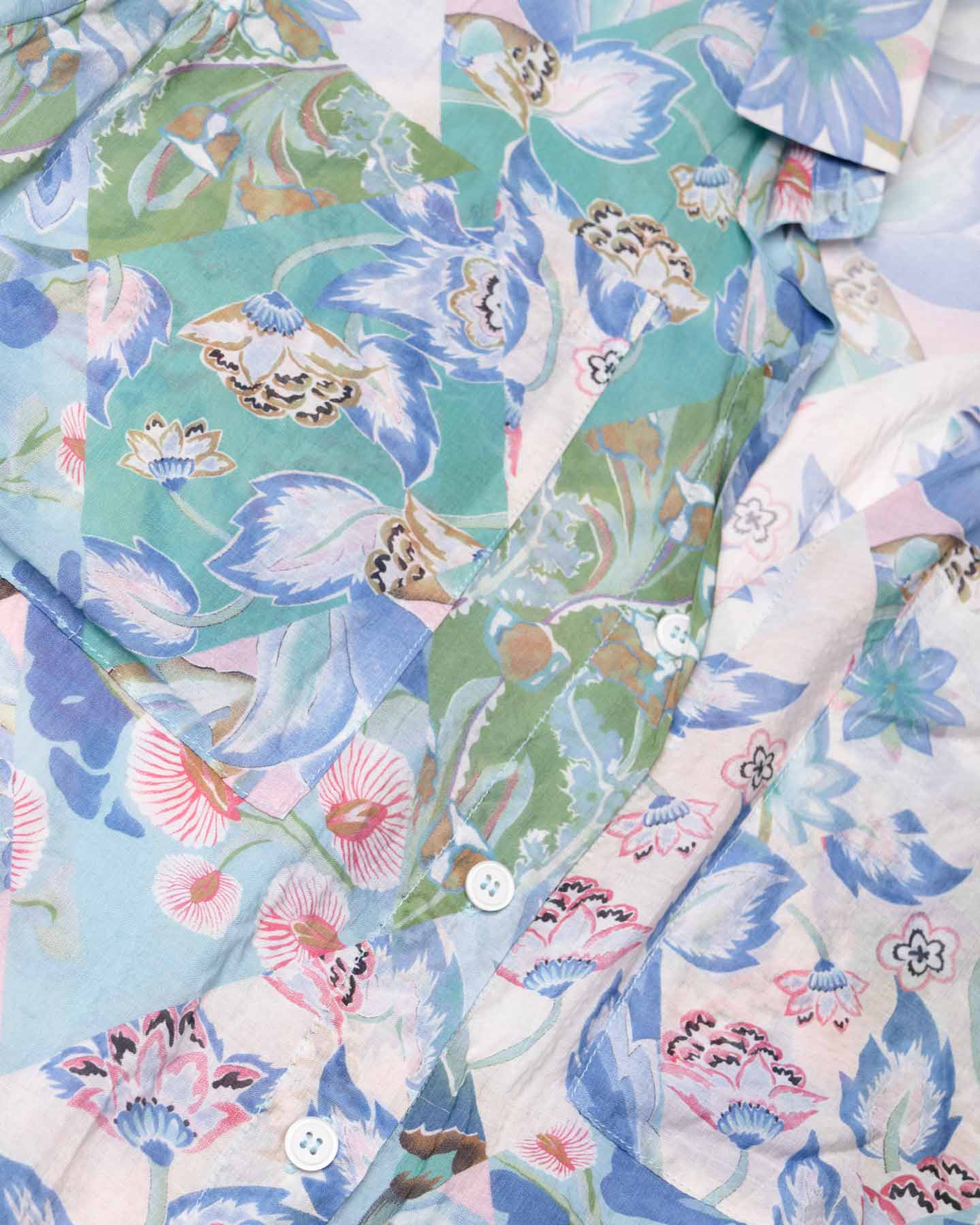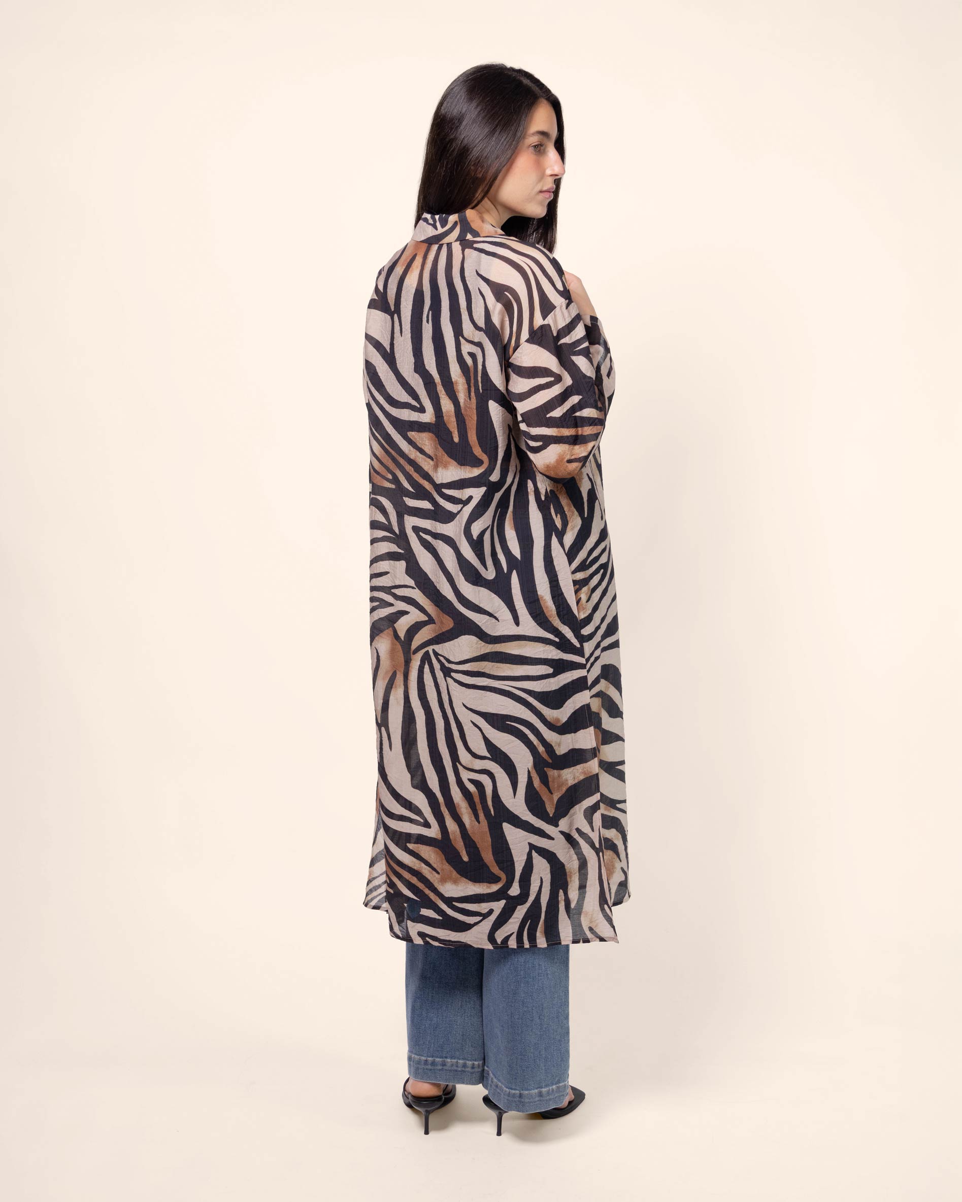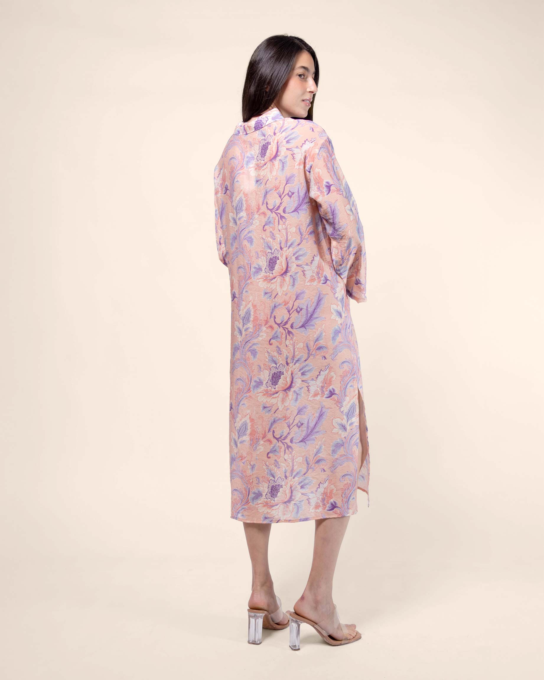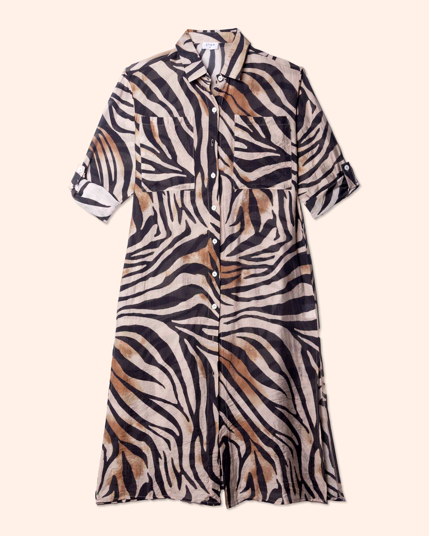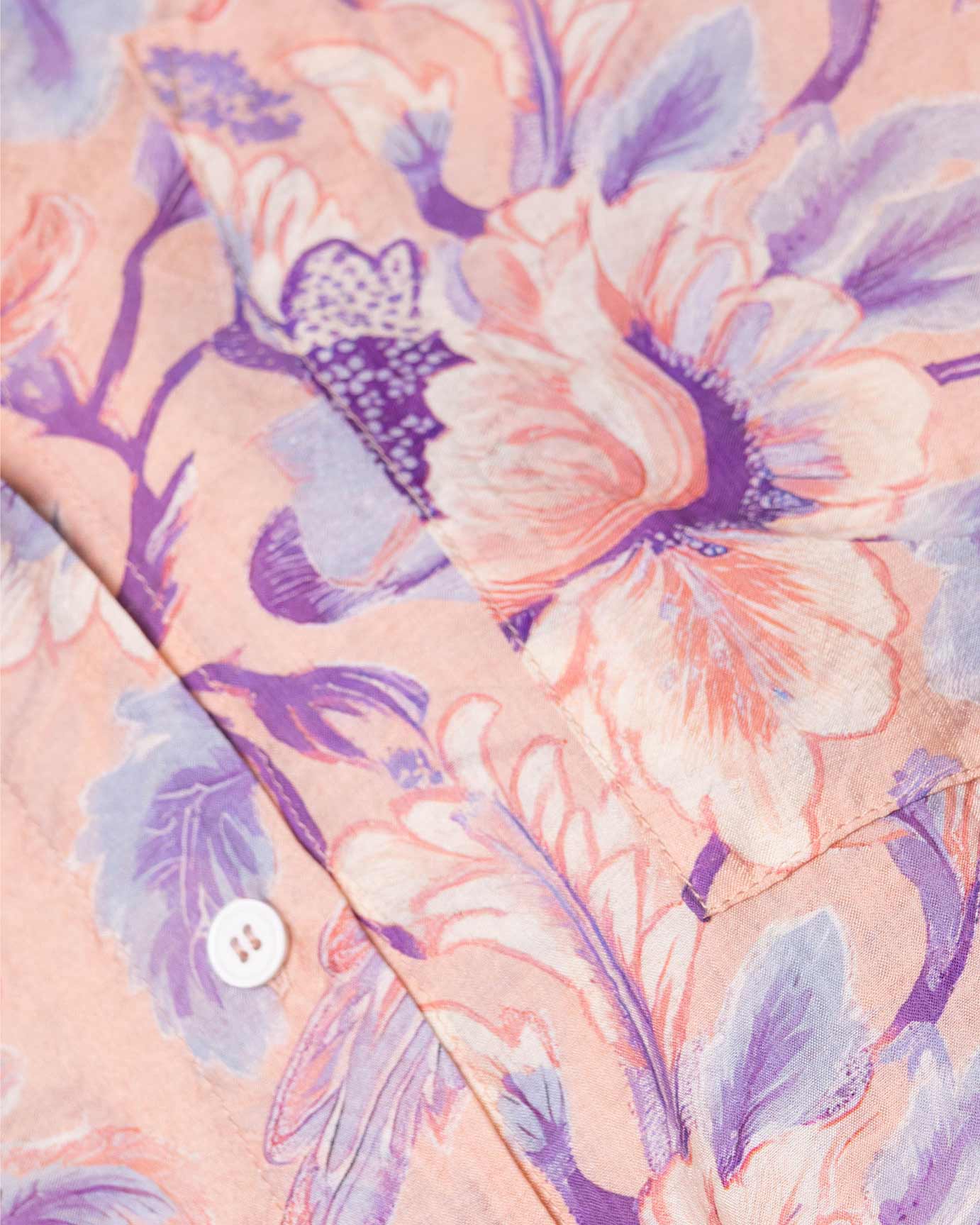 Blusón camisero, manga larga, con roll up y bolsas, tela ligera estampada