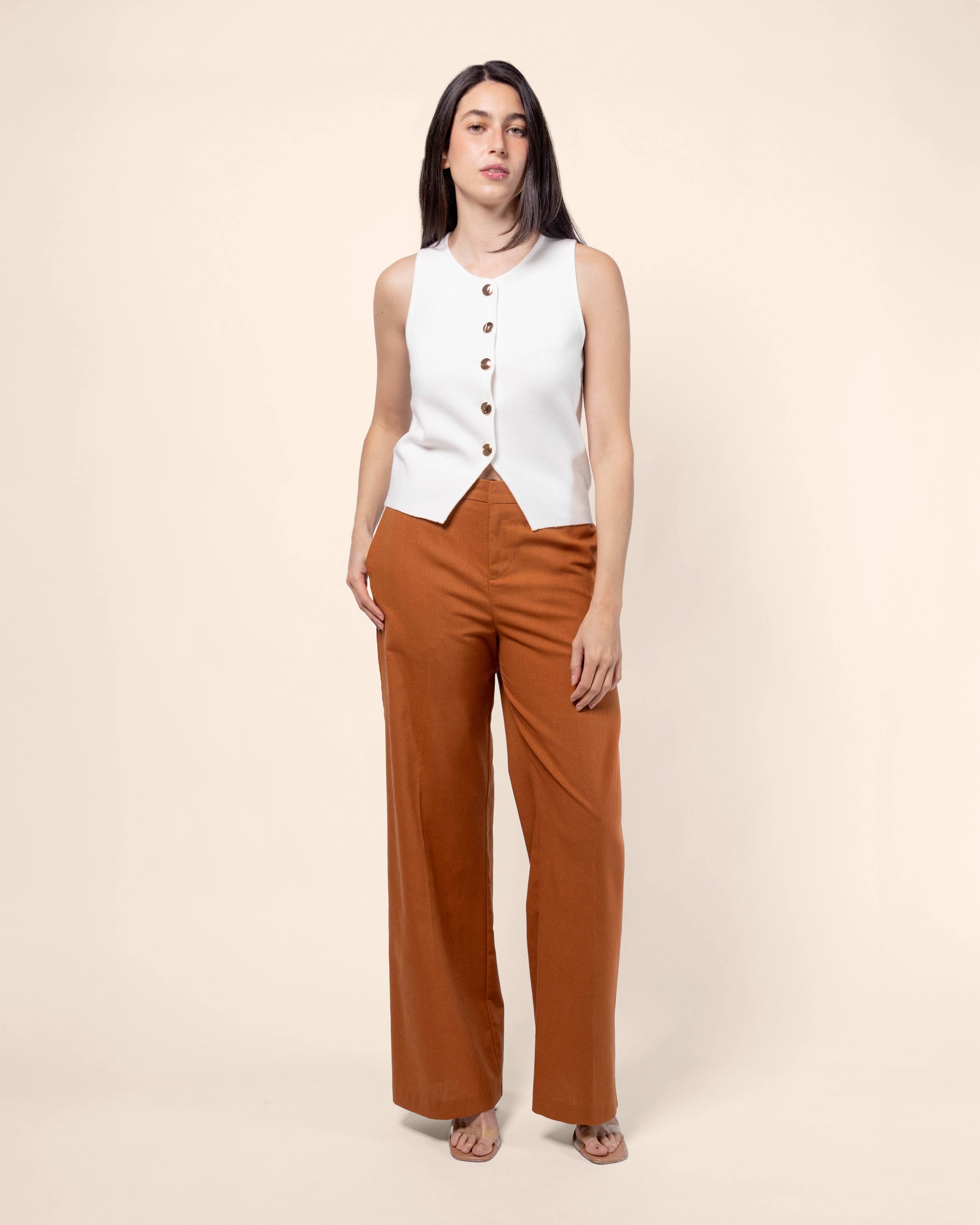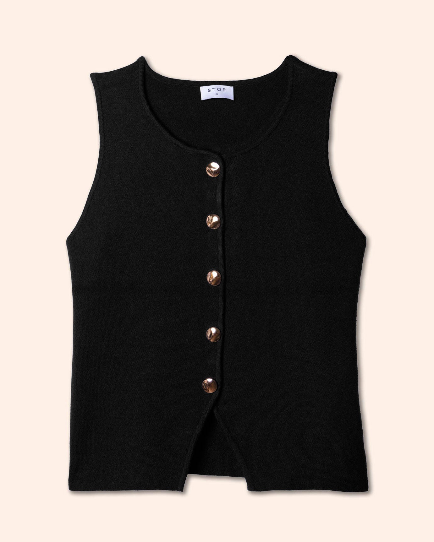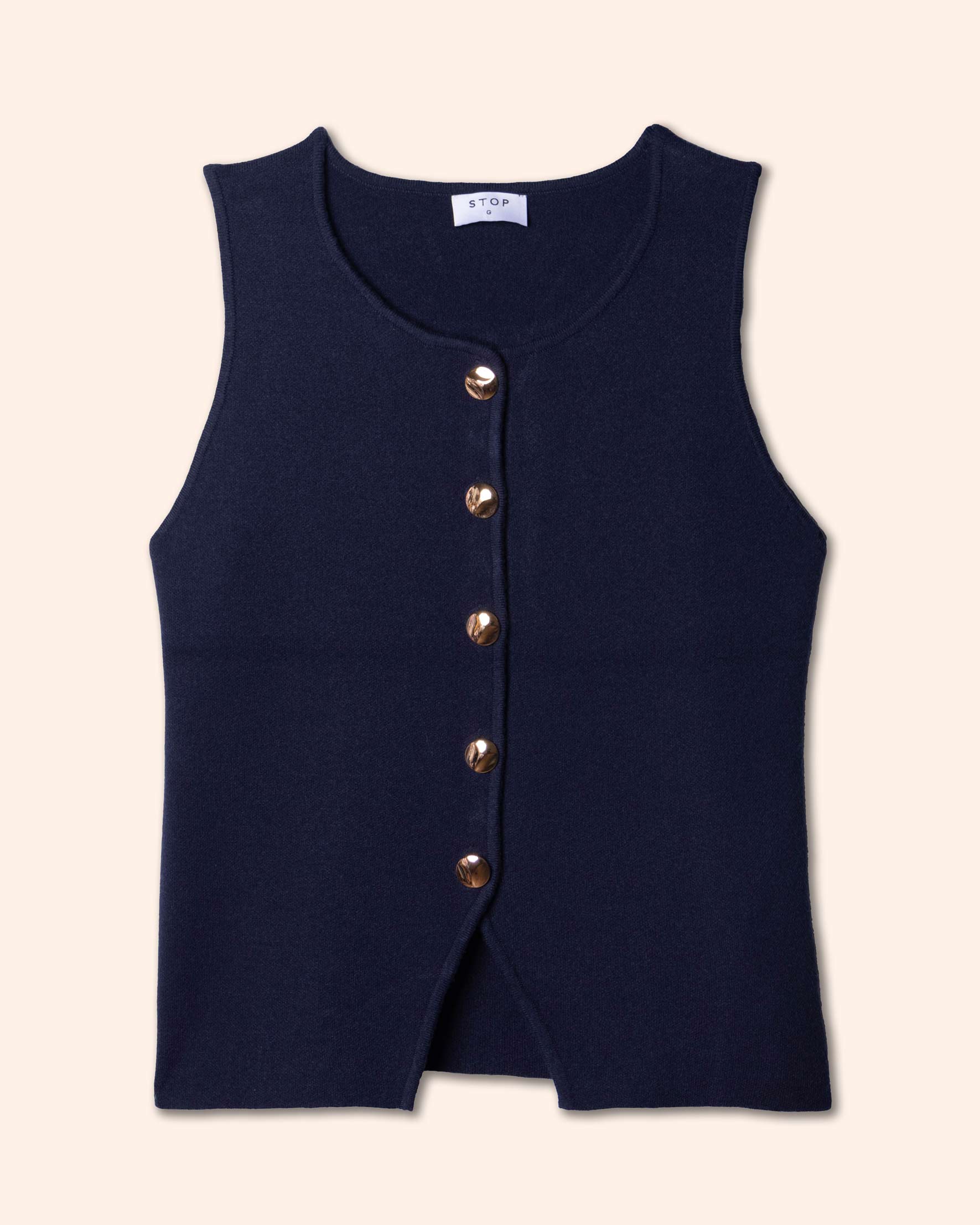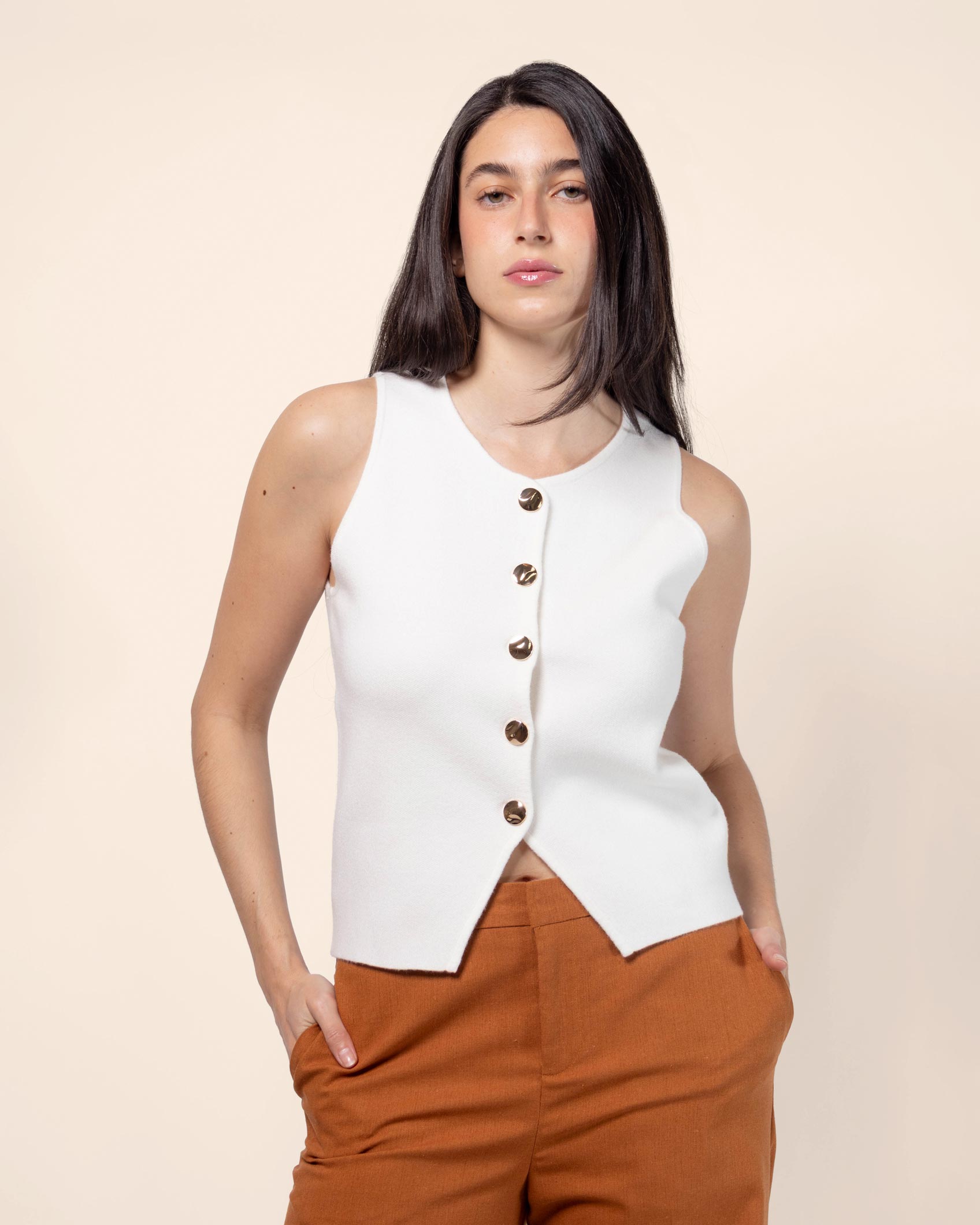 Chaleco tejido corto, con botones y abertura en bajos