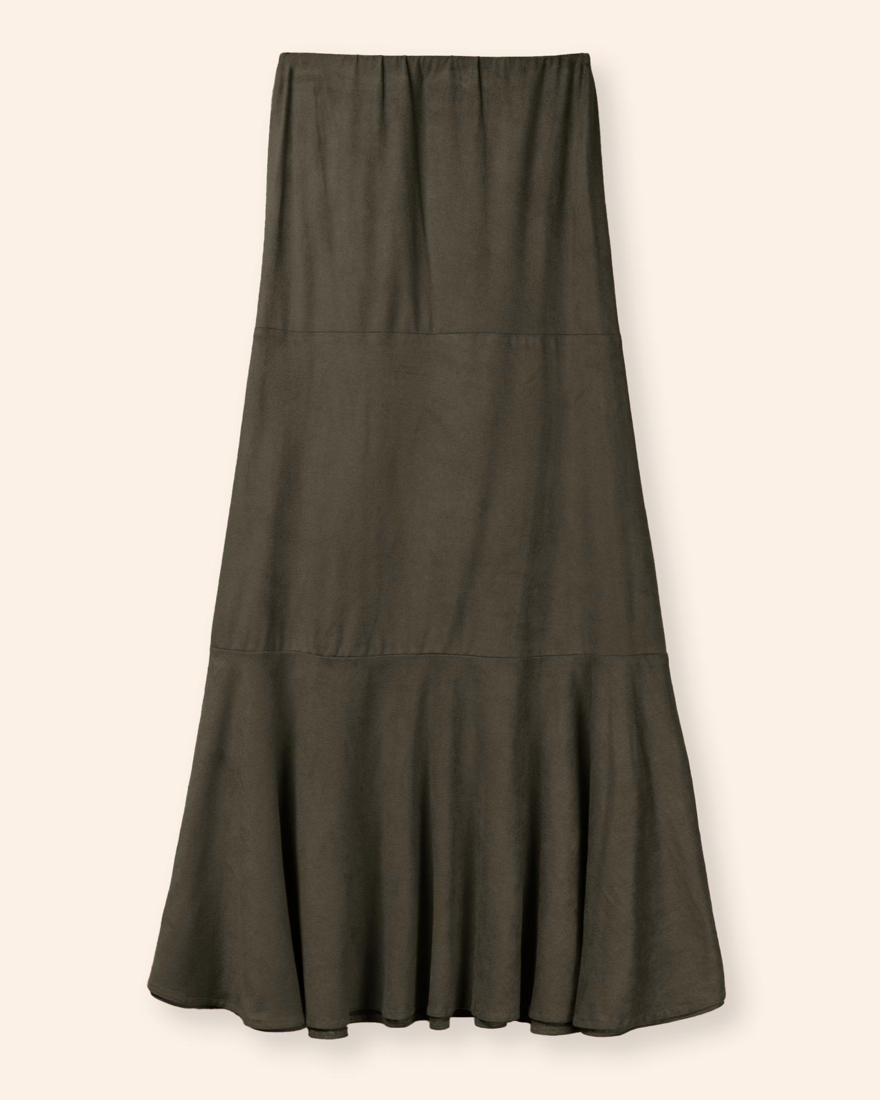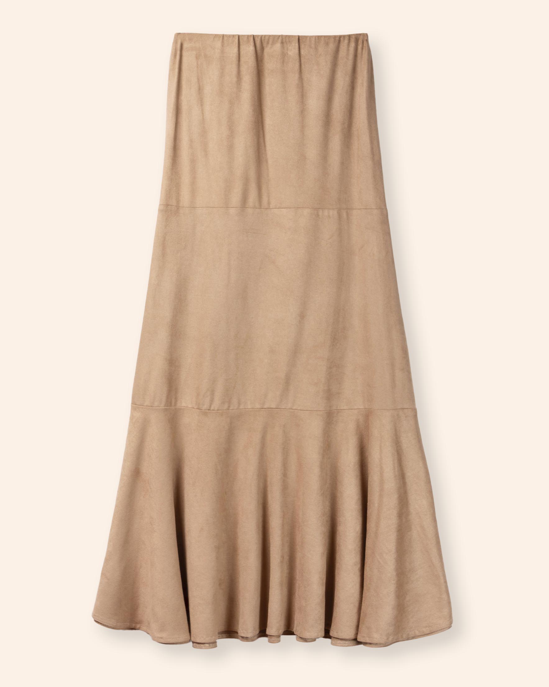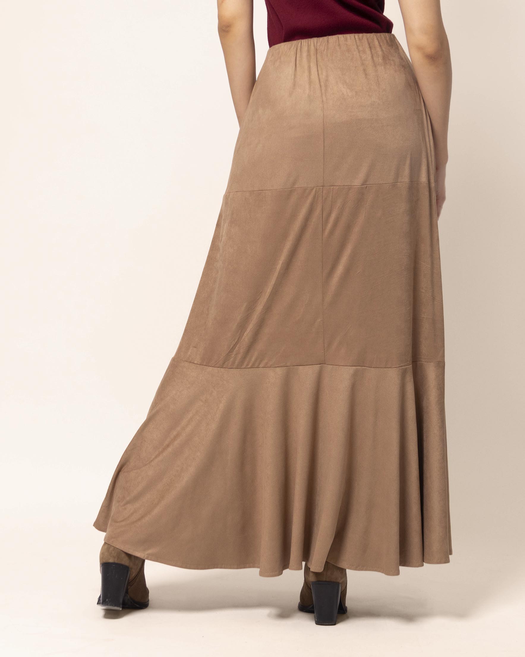 La falda maxi de suede es una opción suave y elegante para el día a día. Su textura efecto ante aporta un toque moderno y la pretina elástica oculta permite libertad de movimiento.