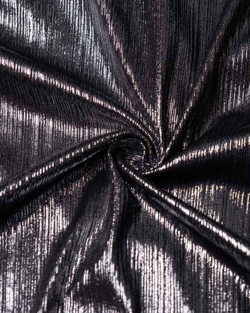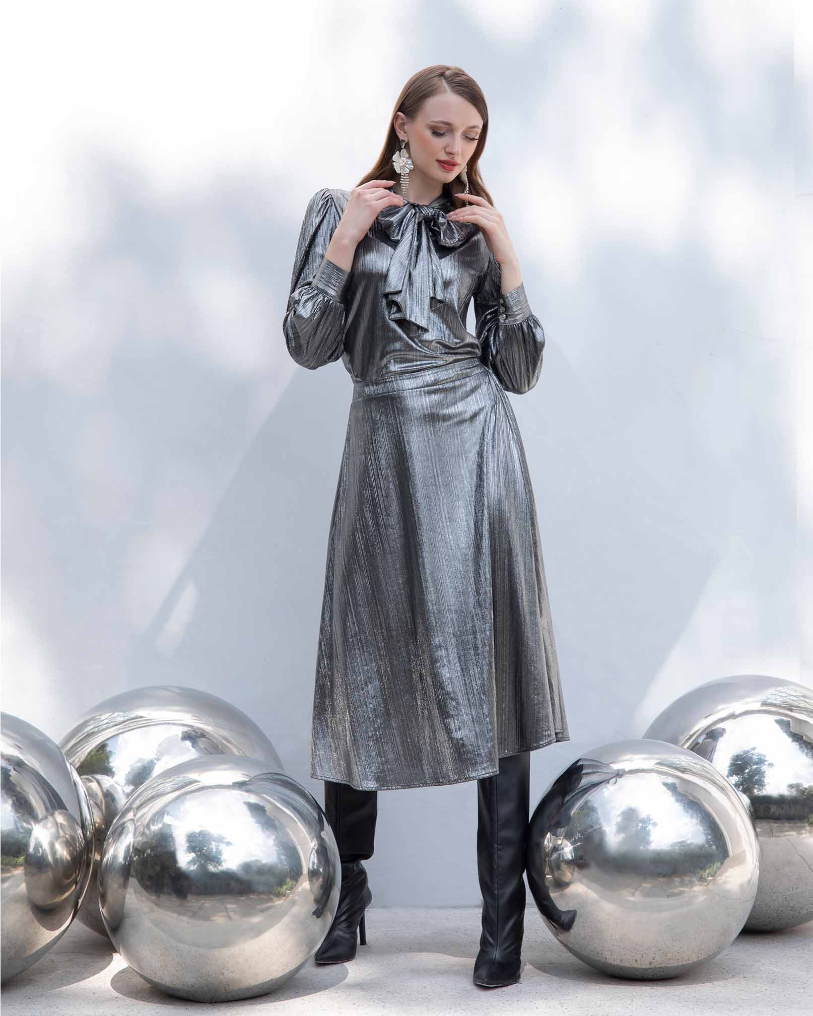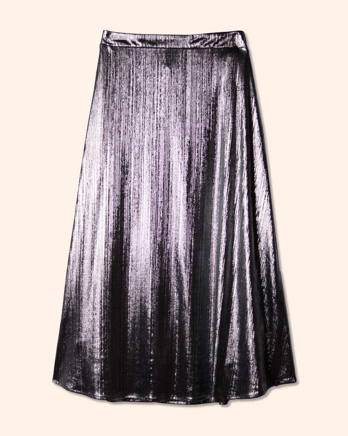 Falda midi, línea A, con tela metálica, con elástico en cintura que aporta confort