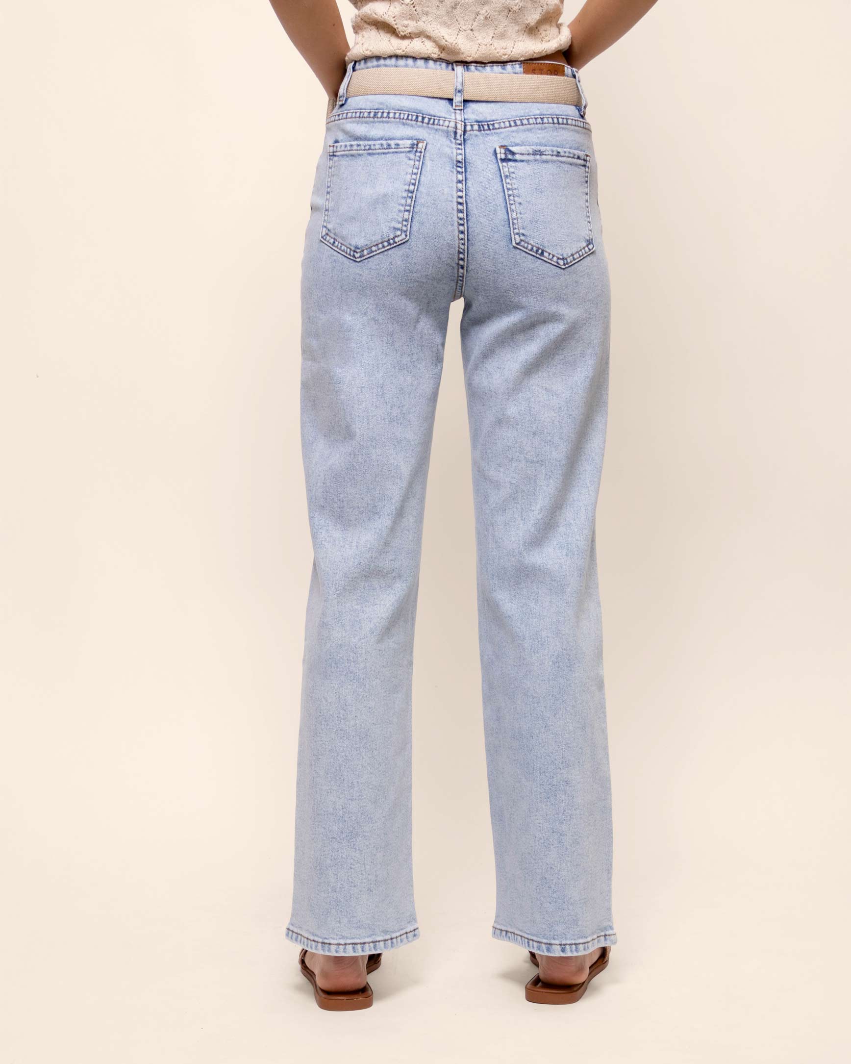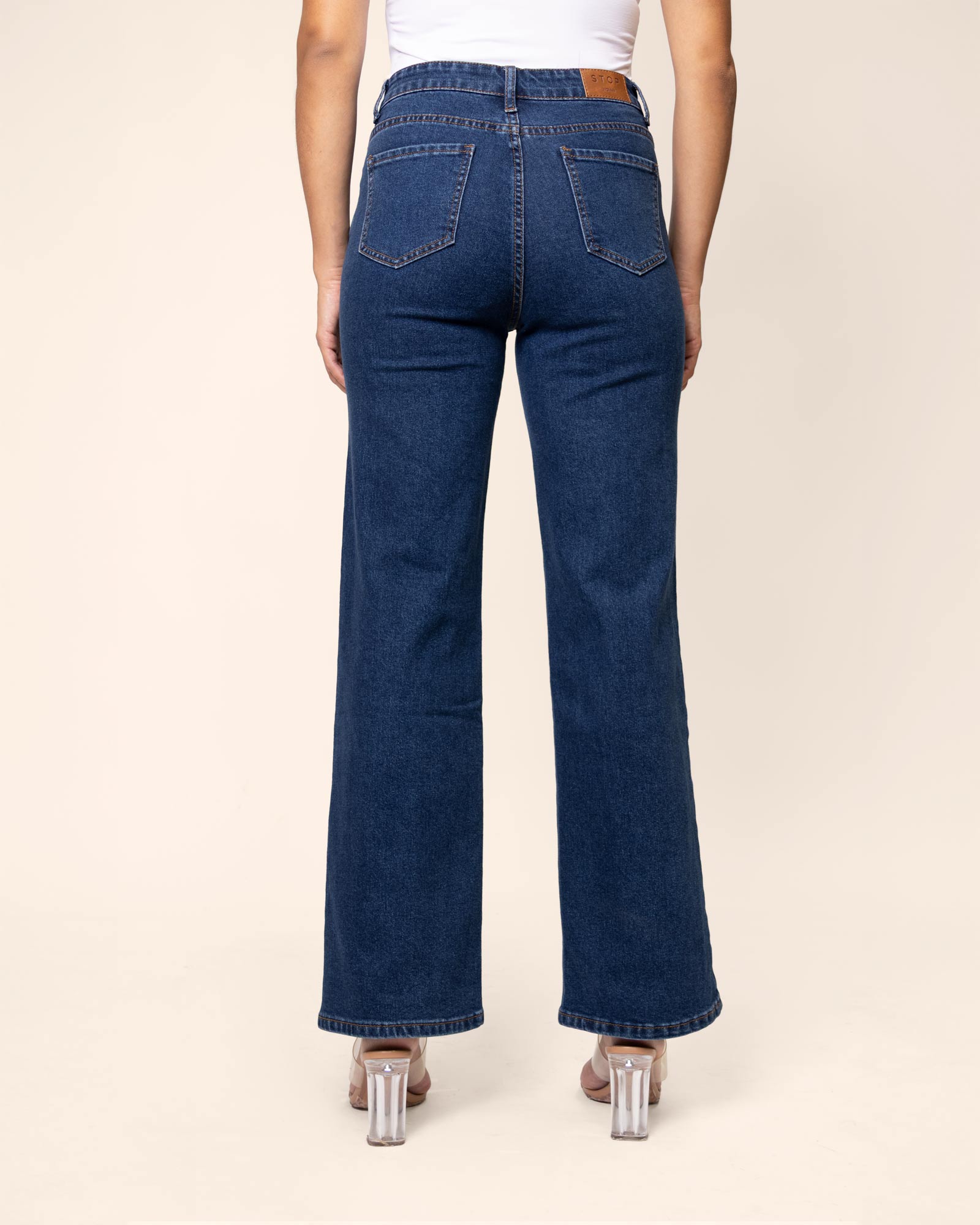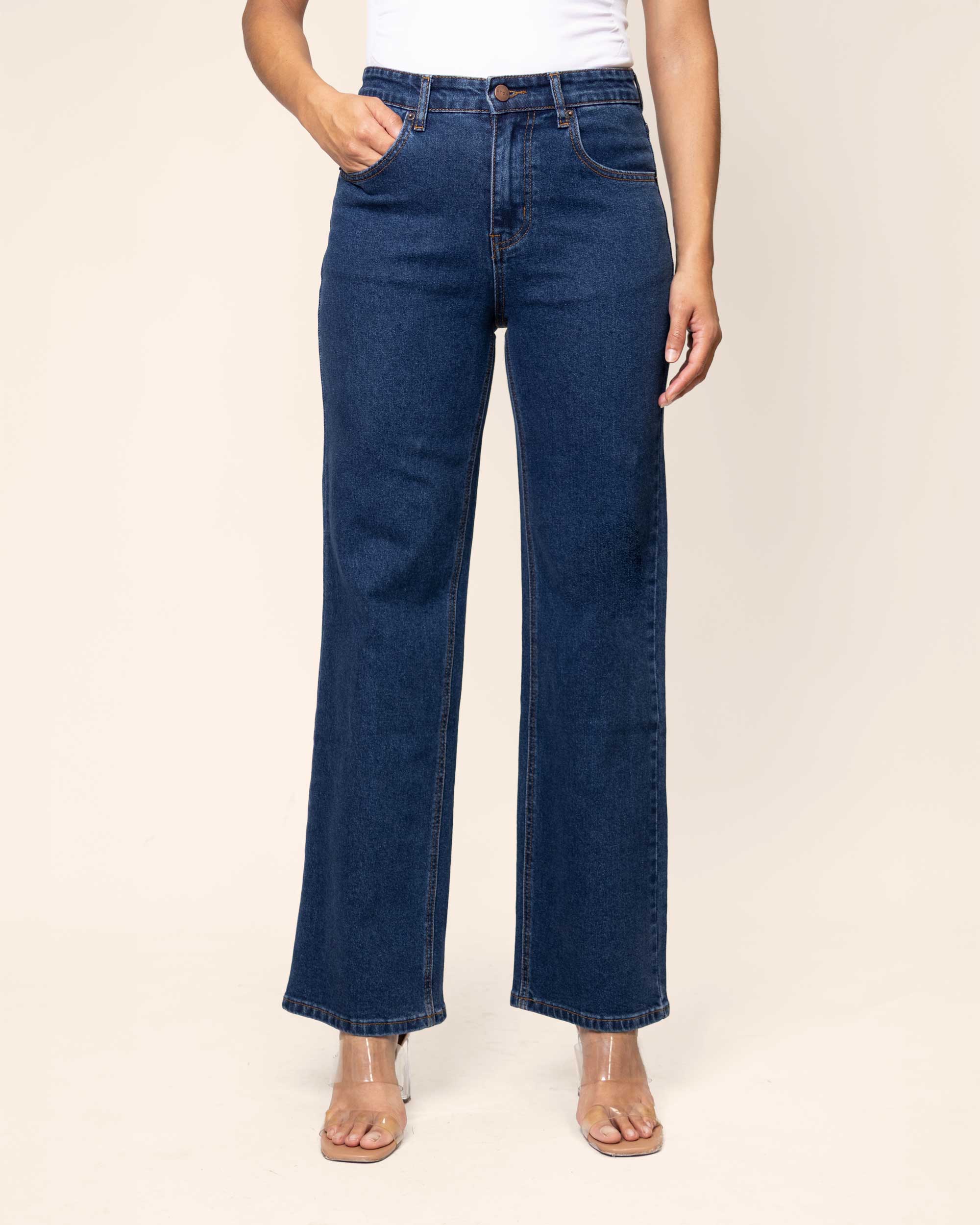 Jeans corte recto, azul mezclilla, tiro alto, con 5 bolsillos, con mezclilla stretch que aporta confort