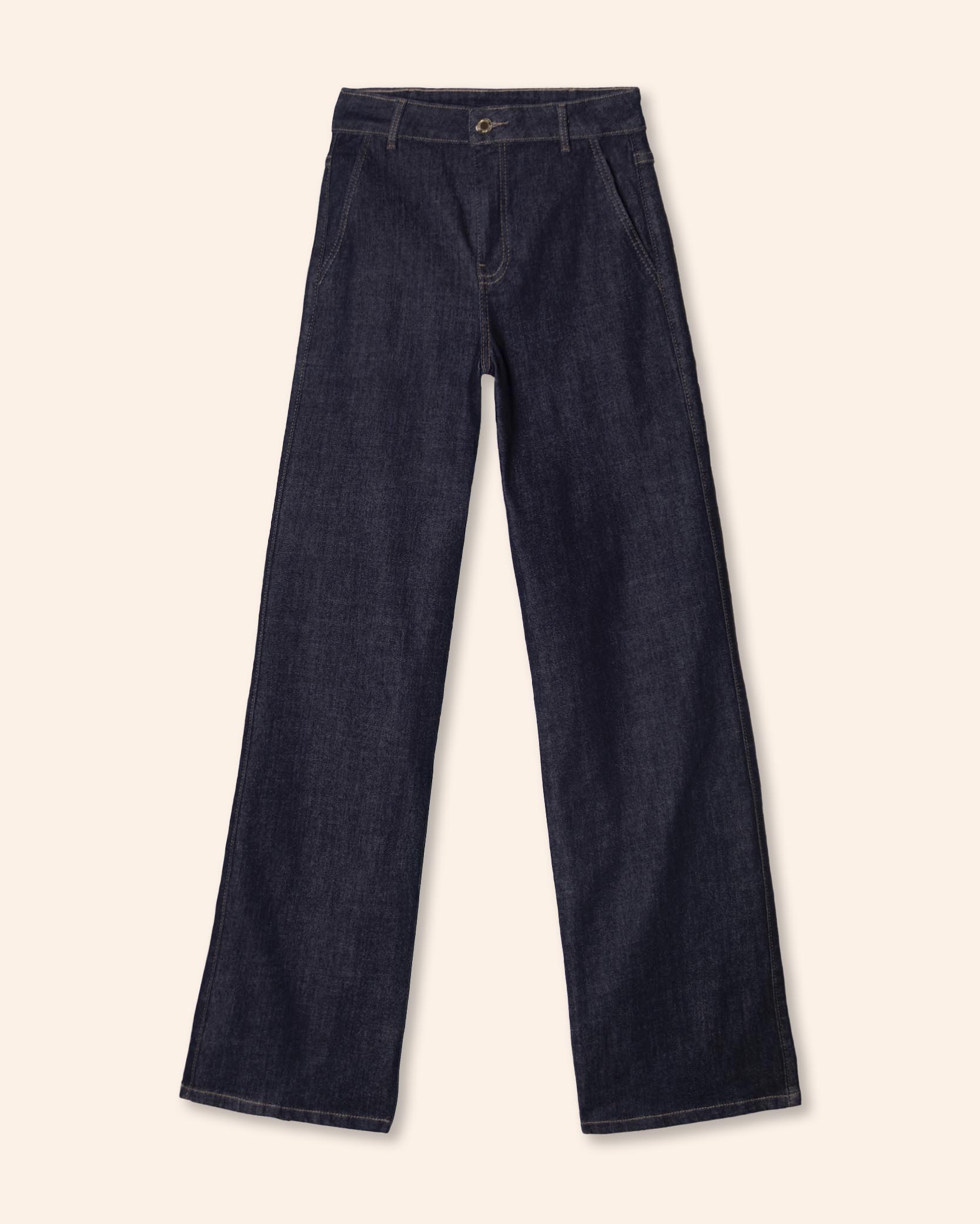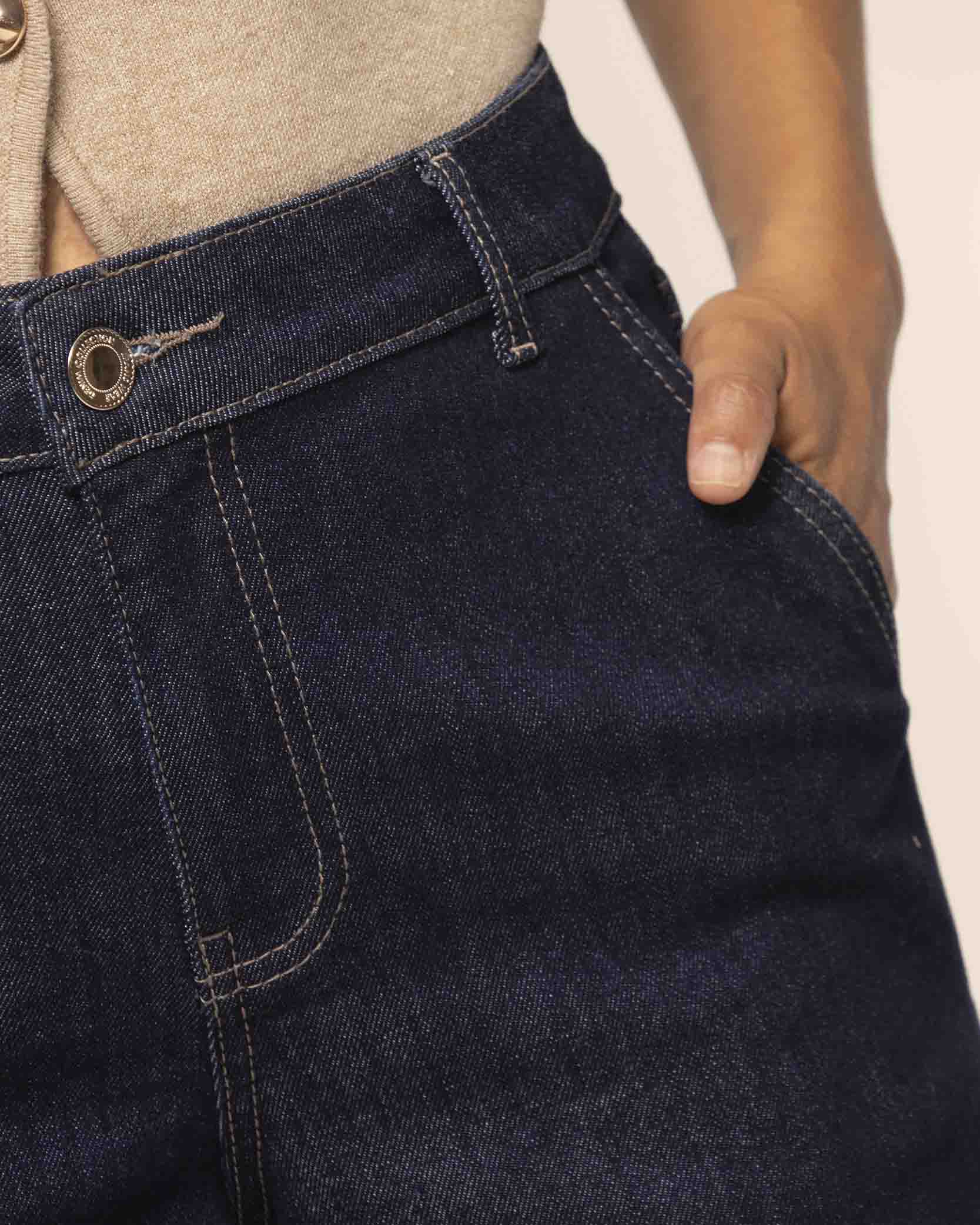 Jeans wide leg lavado oscuro y suavizado, con bolsillos y mezclilla stretch que aporta confort