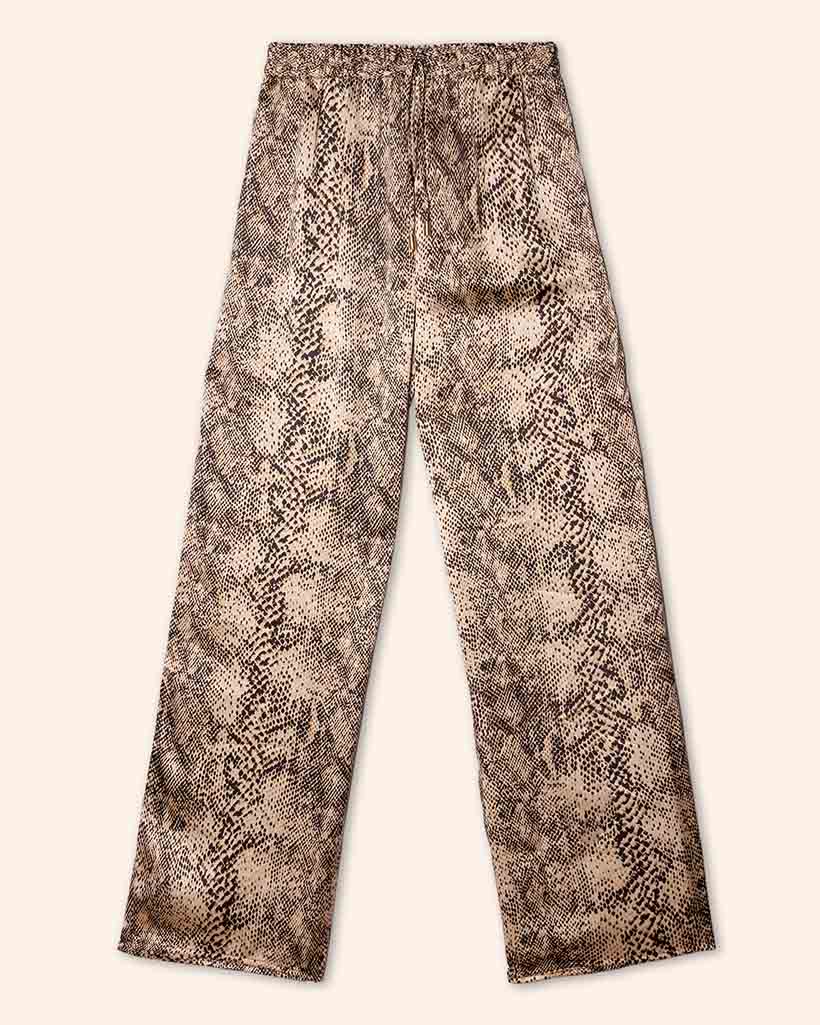 Pantalón pierna amplia, estampado y satinado, con bolsillos, elástico en cintura que aporta confort