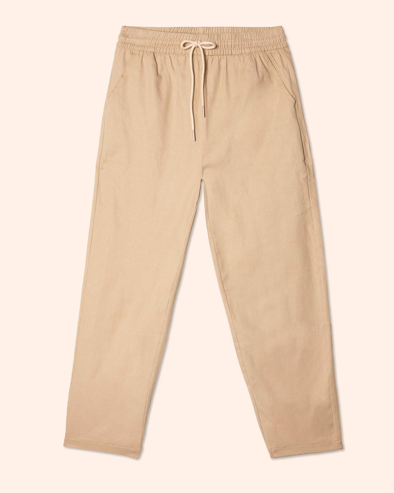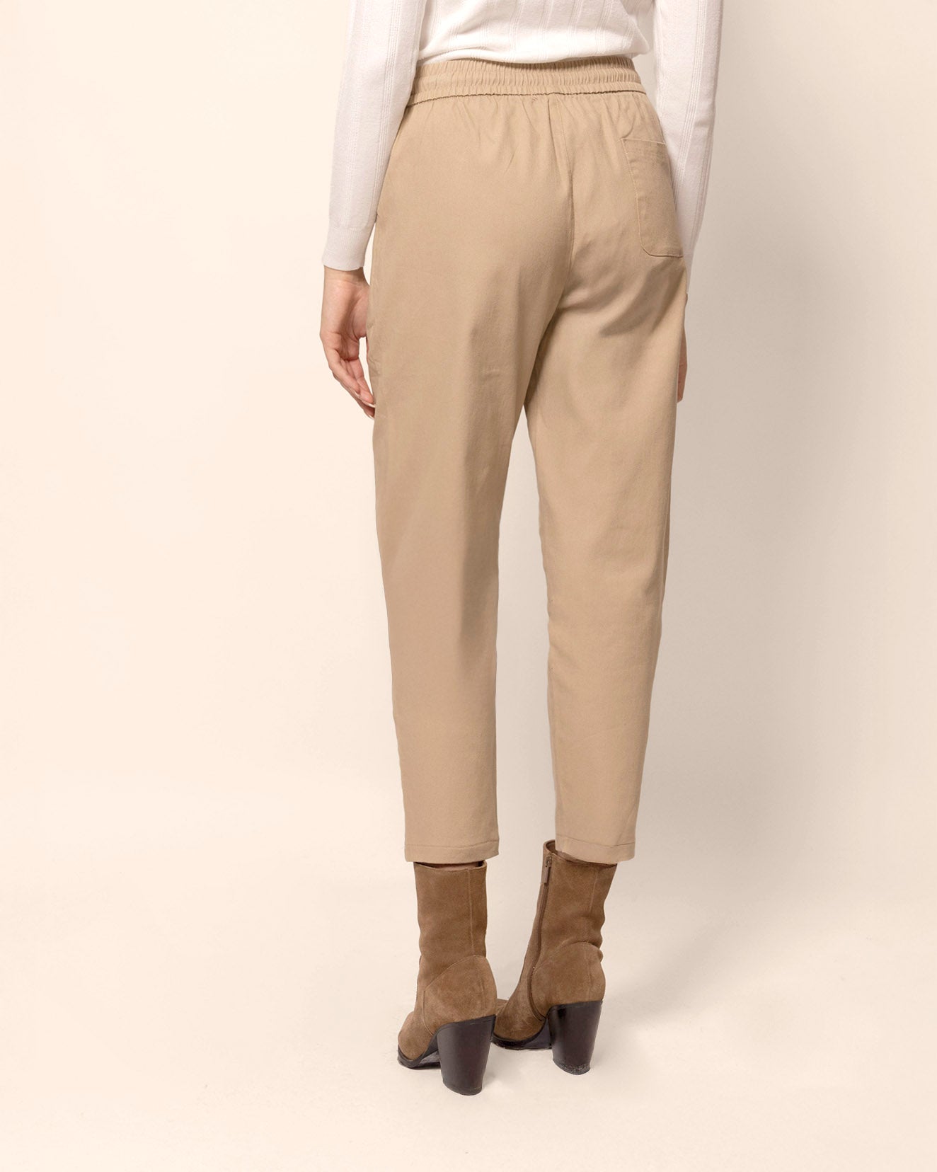 Pantalón entubado de gabardina, con bolsillos y bolsa atrás, elástico y jareta en cintura que aportan confort