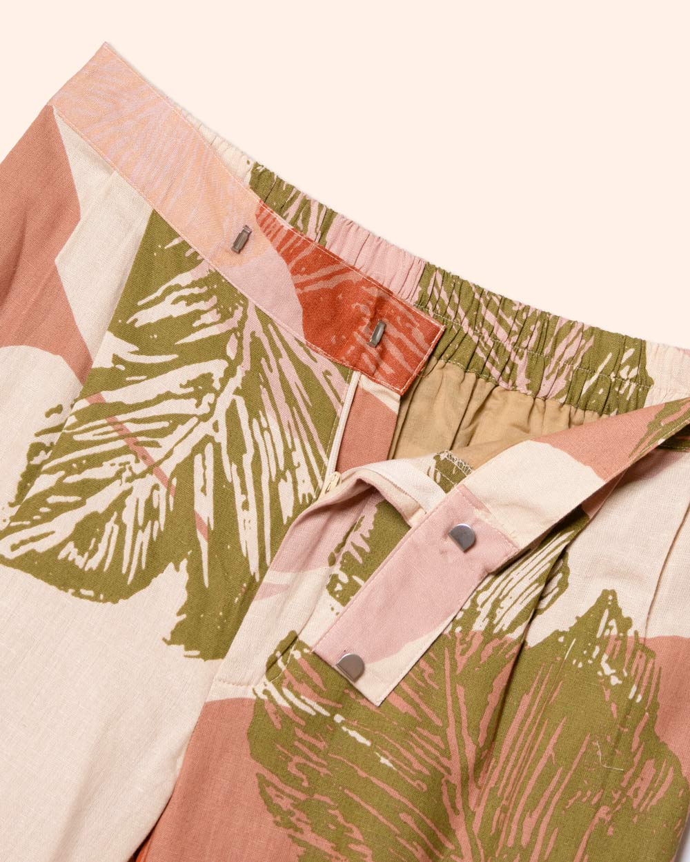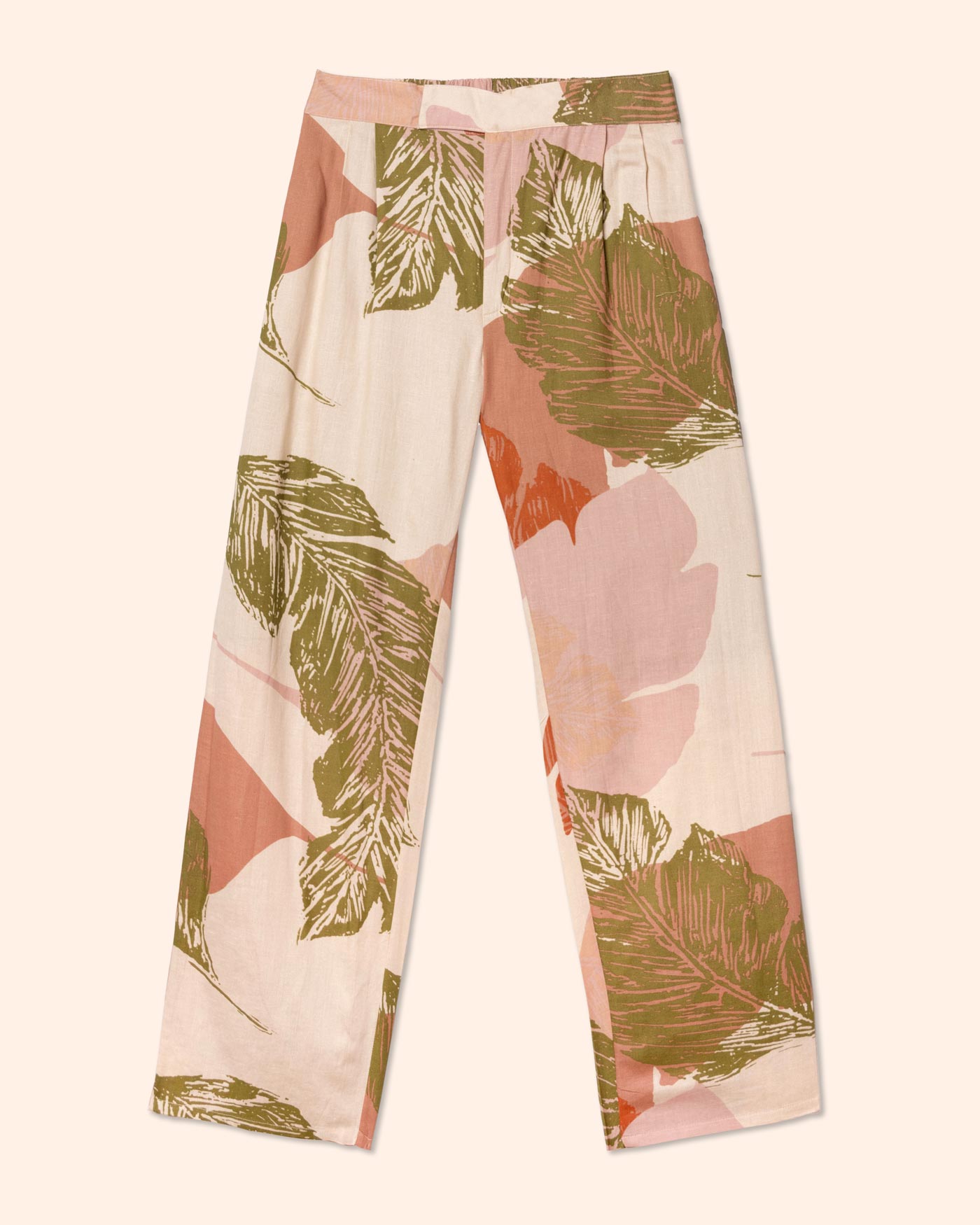 Pantalón pierna recta estampado, pretina cruzada, elástico en espalda, tela efecto lino