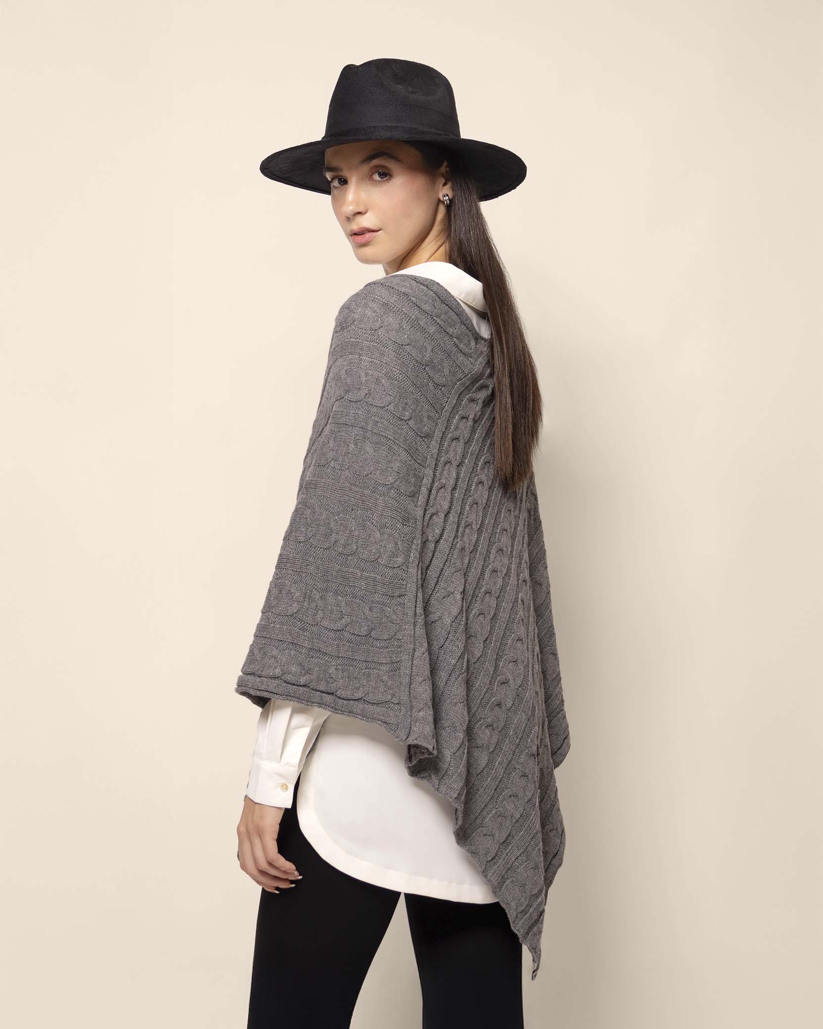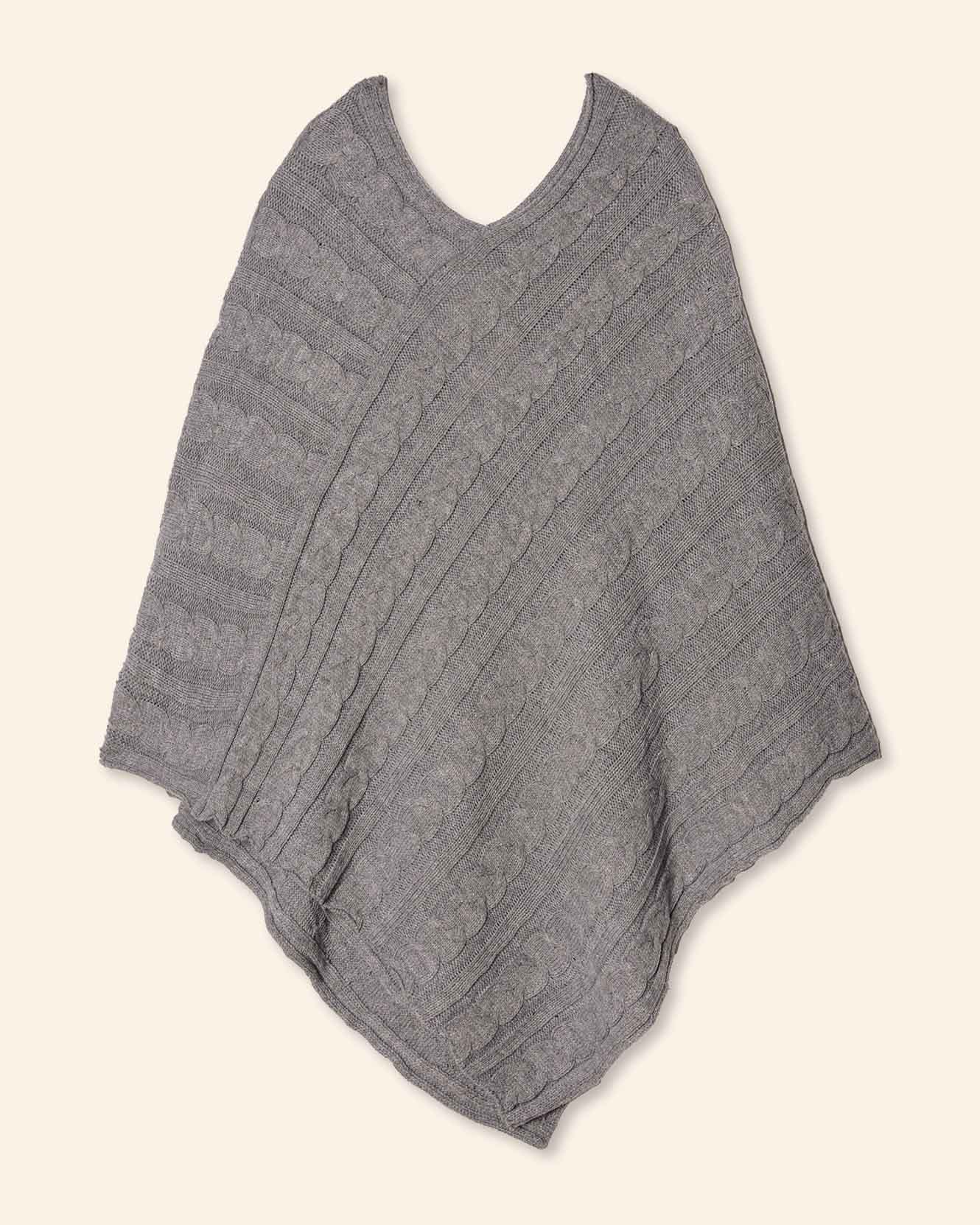 Poncho tejido, cuello V, con trenzas