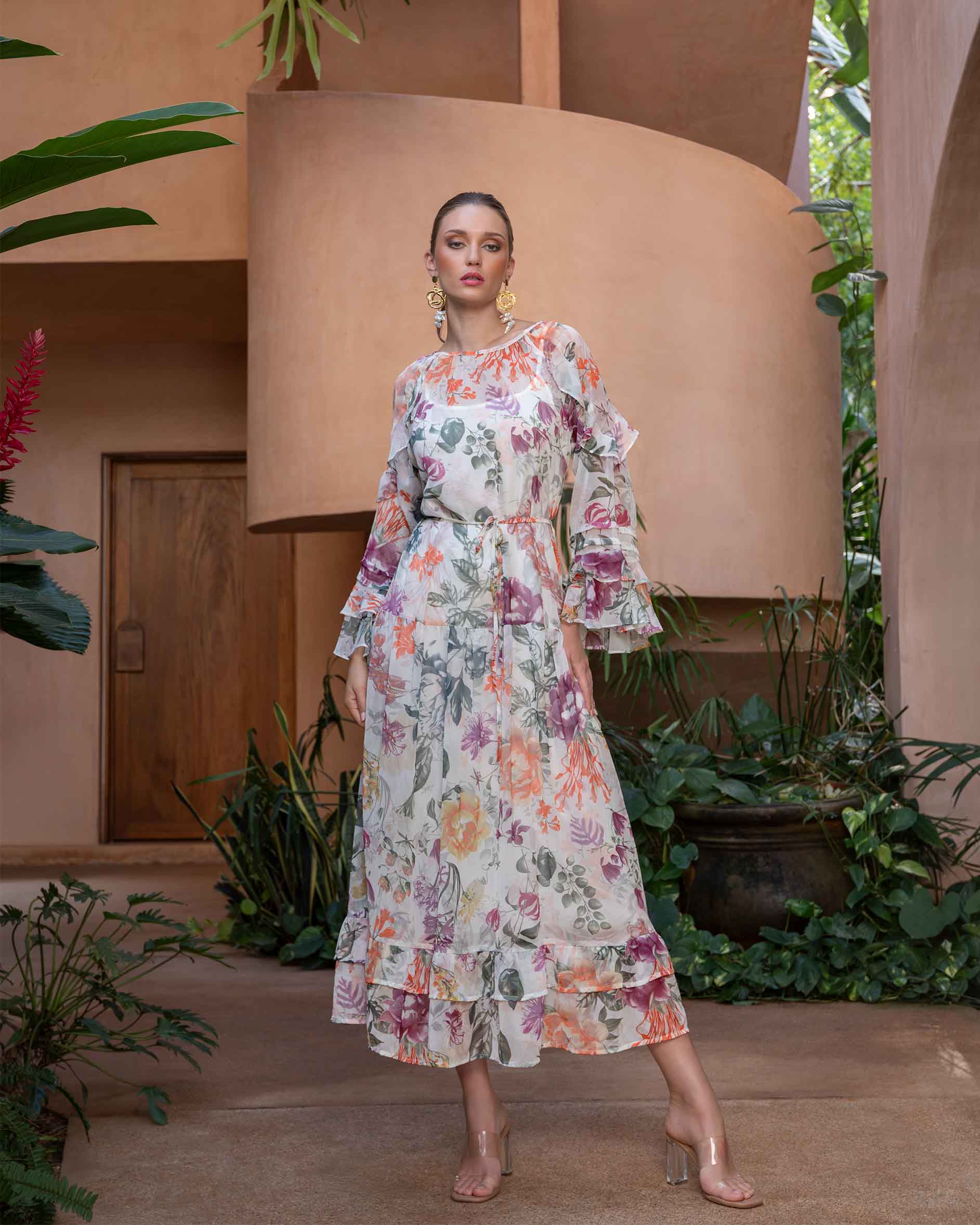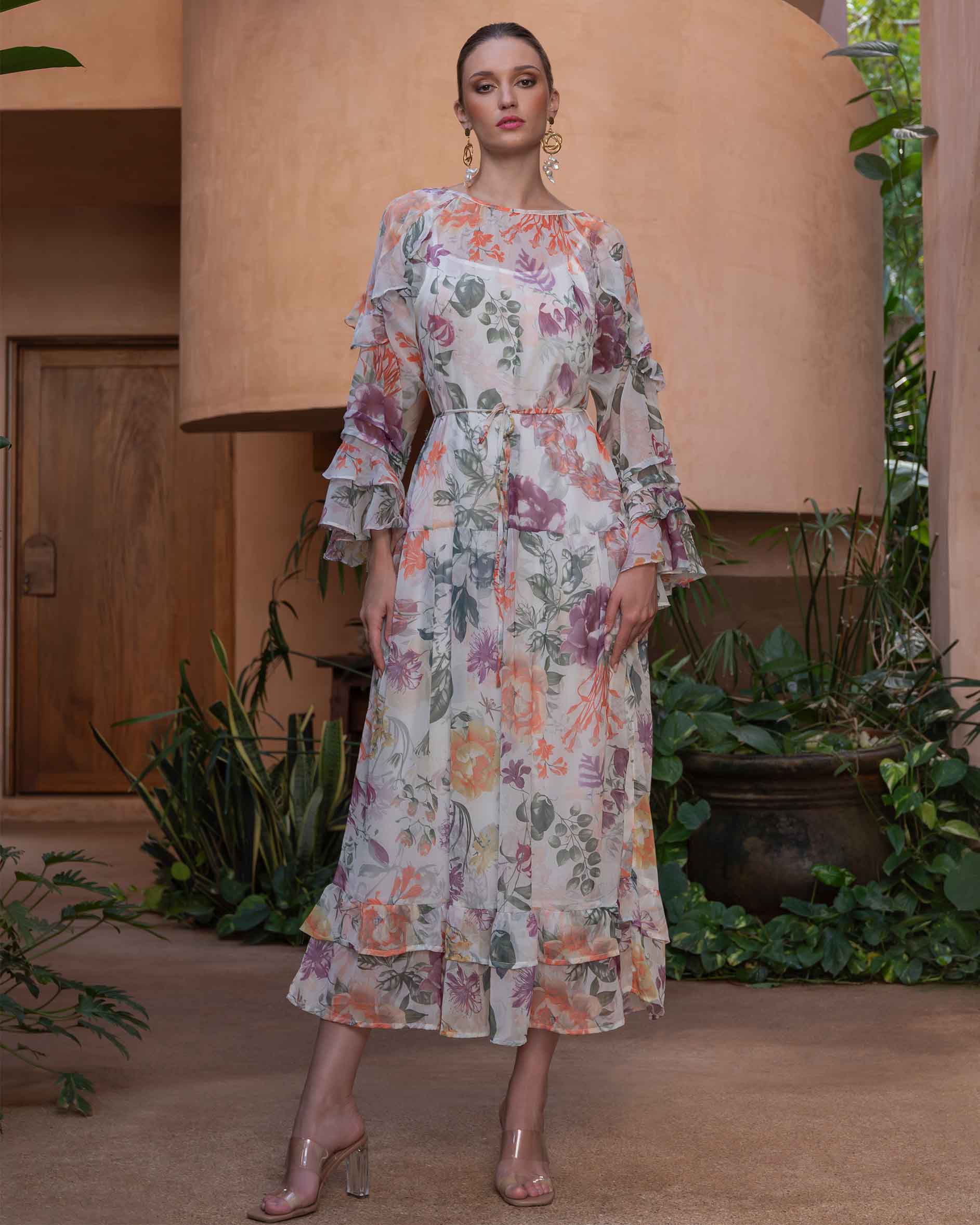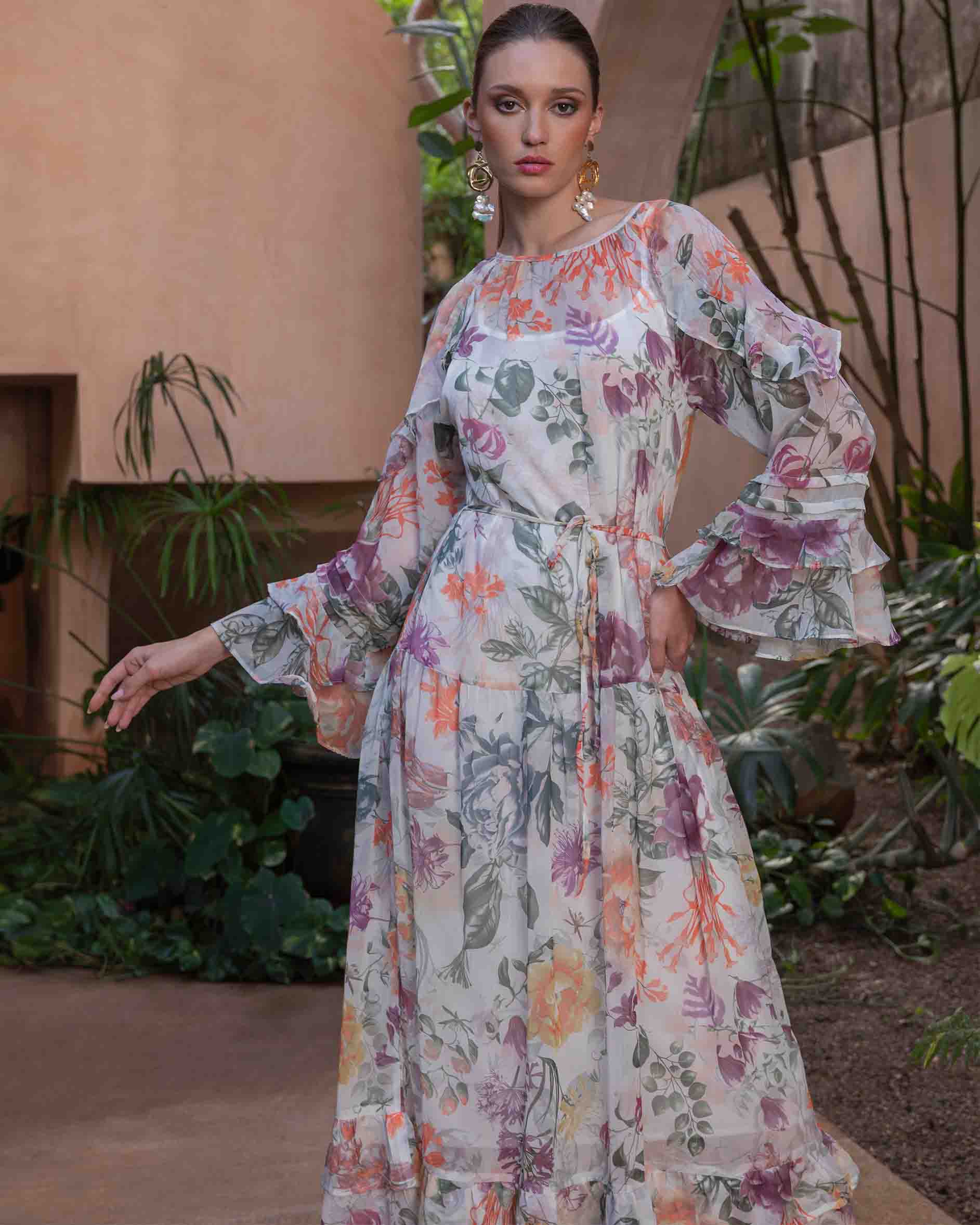 Vestido largo de chifón estampado, con olanes, manga larga, incluye forro y cinturón