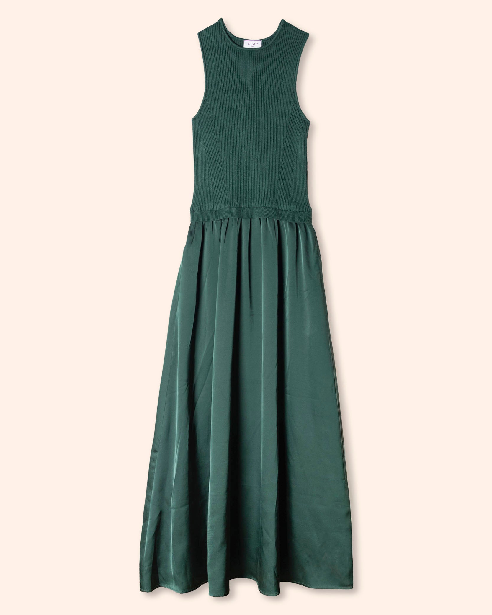 Descubre la elegancia y el confort de este vestido largo de STOP. Está confeccionado en una combinación de 2 tipos de tejido: tejido de punto en la parte arriba, que se ajusta al cuerpo y una tela satinada en la parte de abajo, que brinda libertad de movimiento y suavidad al tacto. Cuenta con cuello redondo y no tiene mangas, brindando frescura y confort. Encuéntralo disponible en color negro y verde botella.