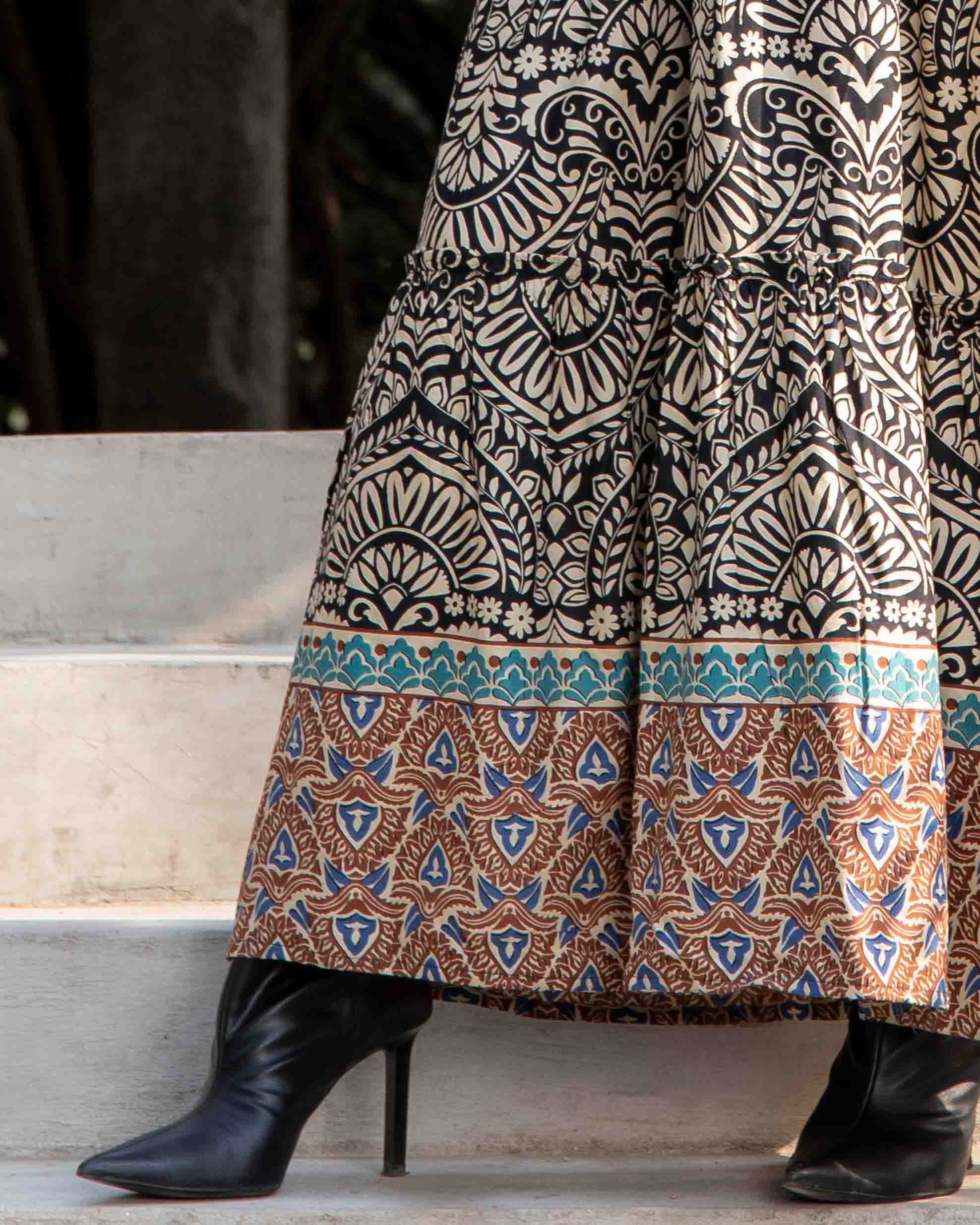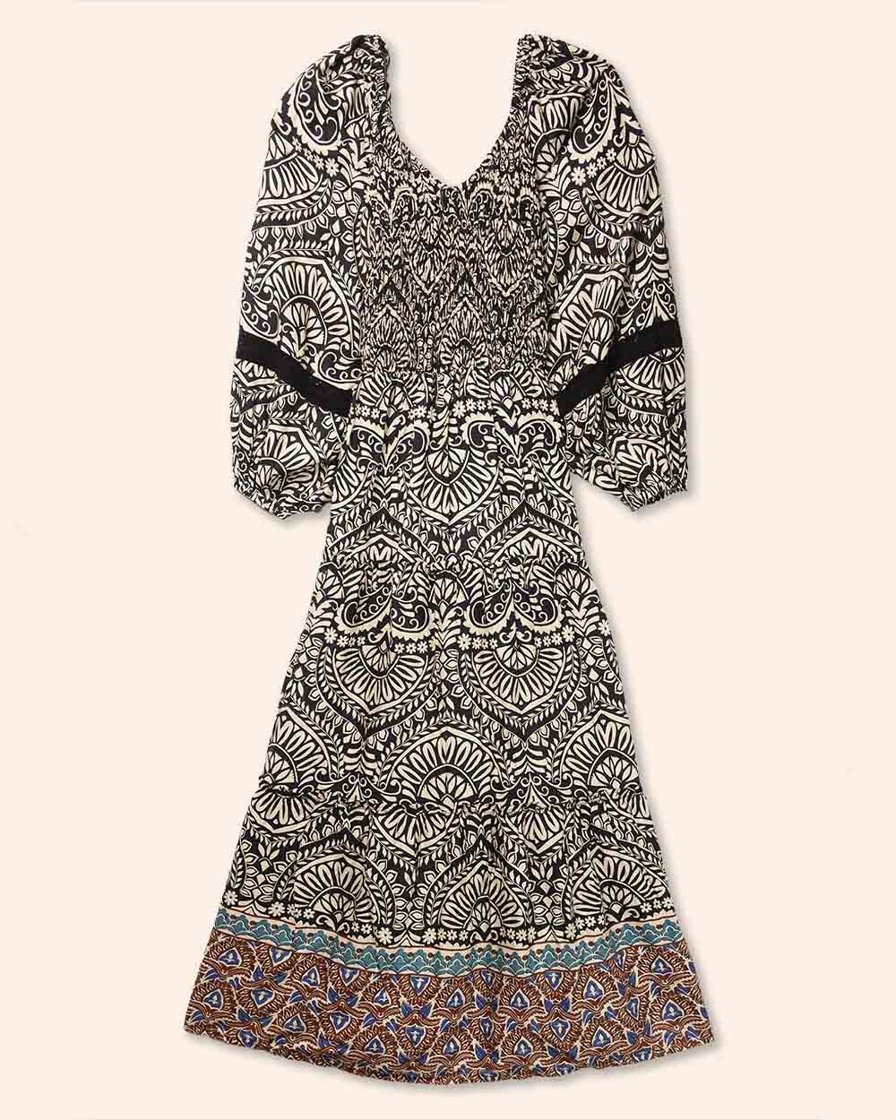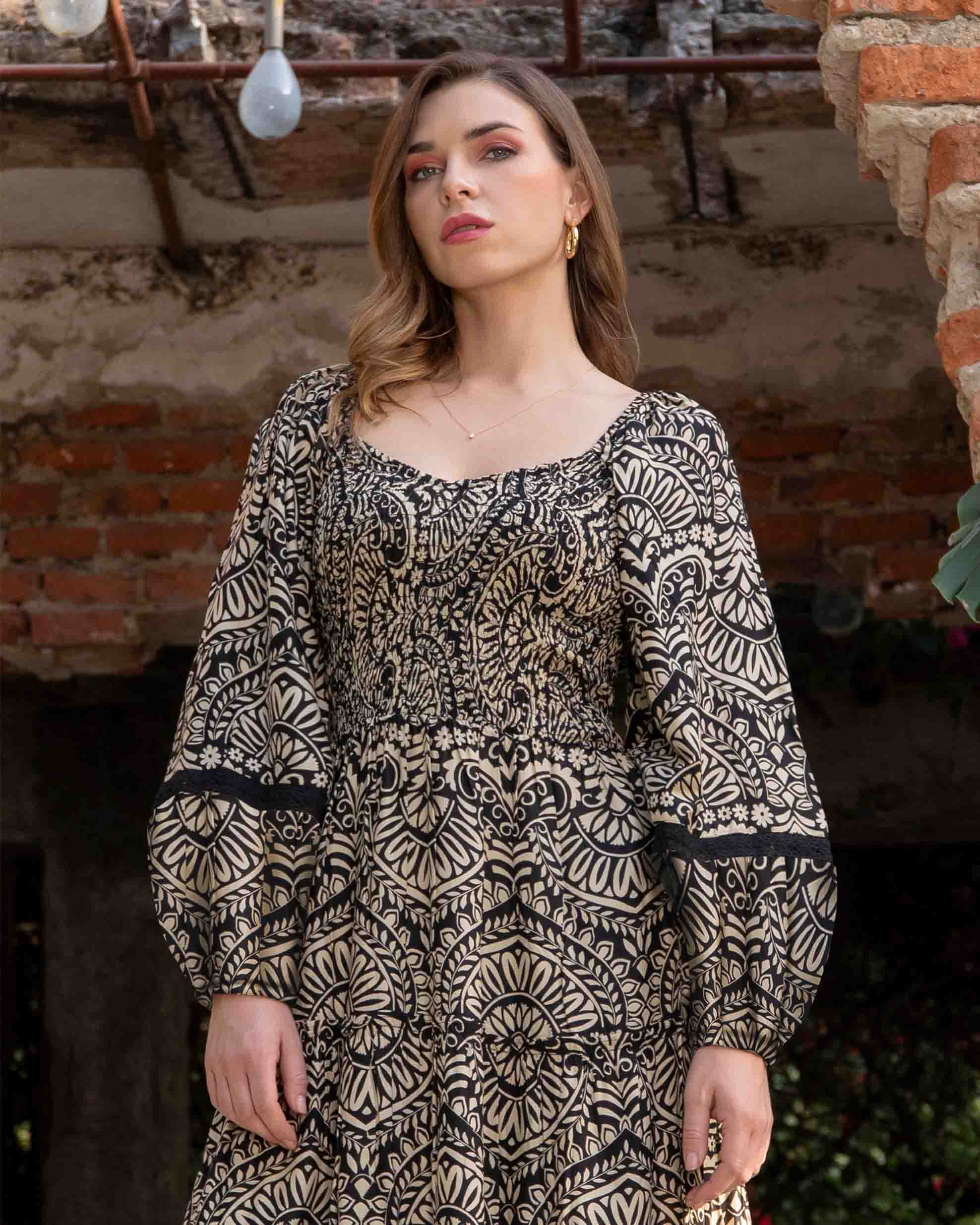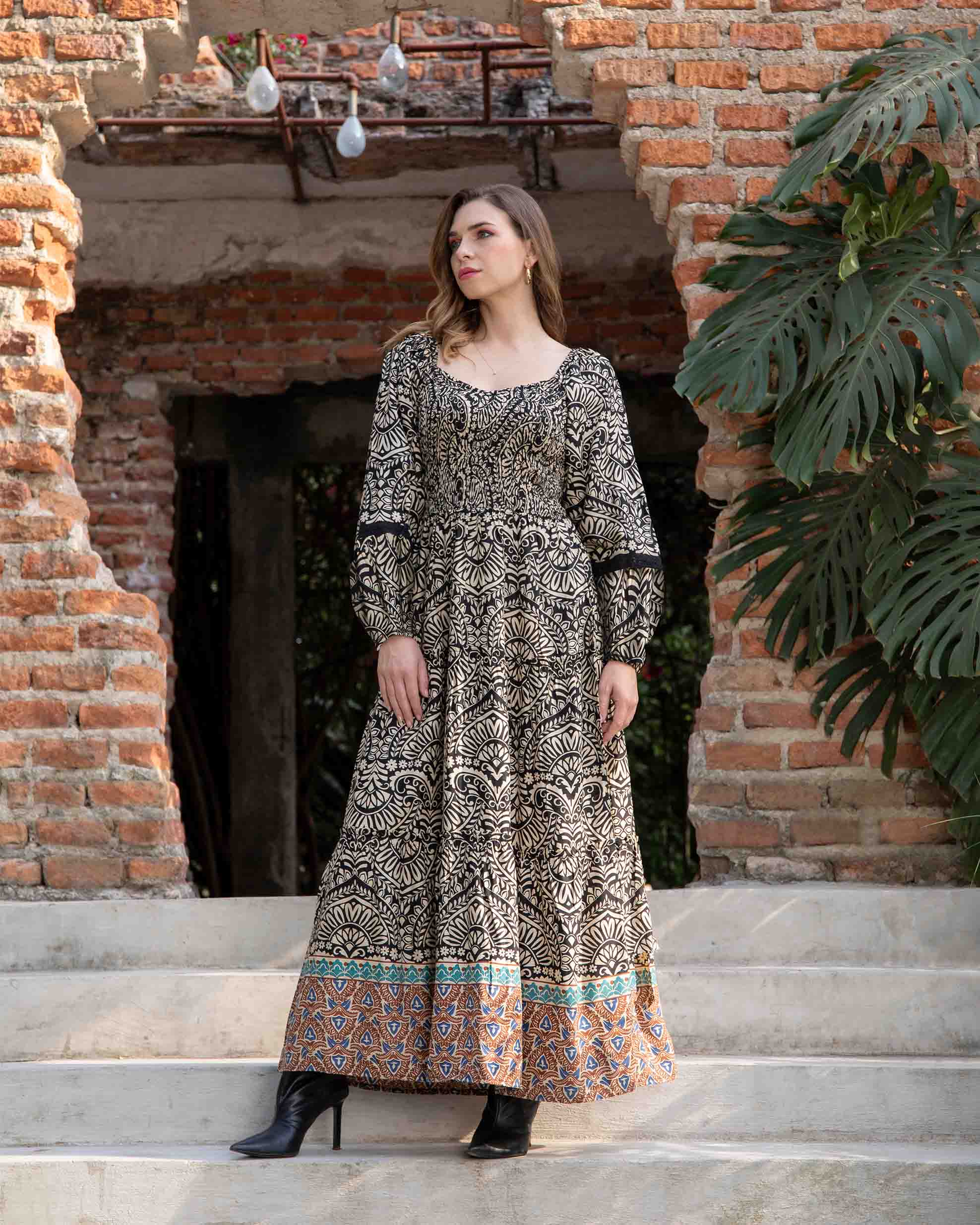 Con un cautivador estampado en tonos crema y negro y un ribete en la falda con motivos étnicos en azul y terracota, es ideal para un look boho-chic sofisticado. Combina este vestido con botas altas de tacón para un look de invierno o transición, como se ve en las imágenes, o con sandalias de cuero y un bolso de mimbre para los días más cálidos. Es la prenda ideal para eventos especiales, una salida casual, o simplemente para sentirte fabulosa en tu día a día.