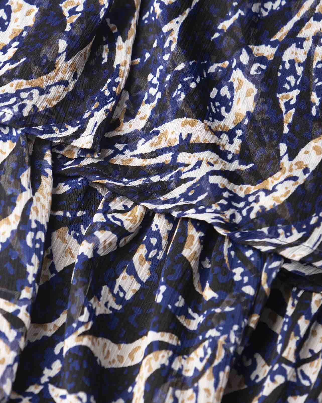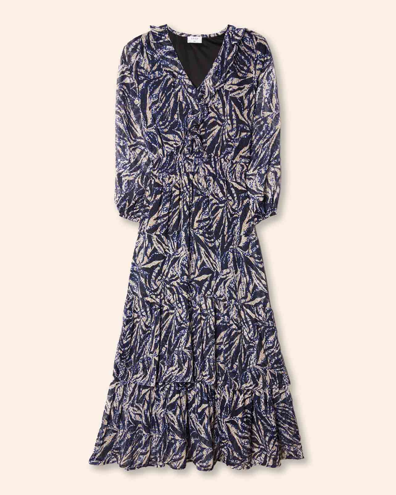 Vestido largo manga larga, estampado, con cortes en falda