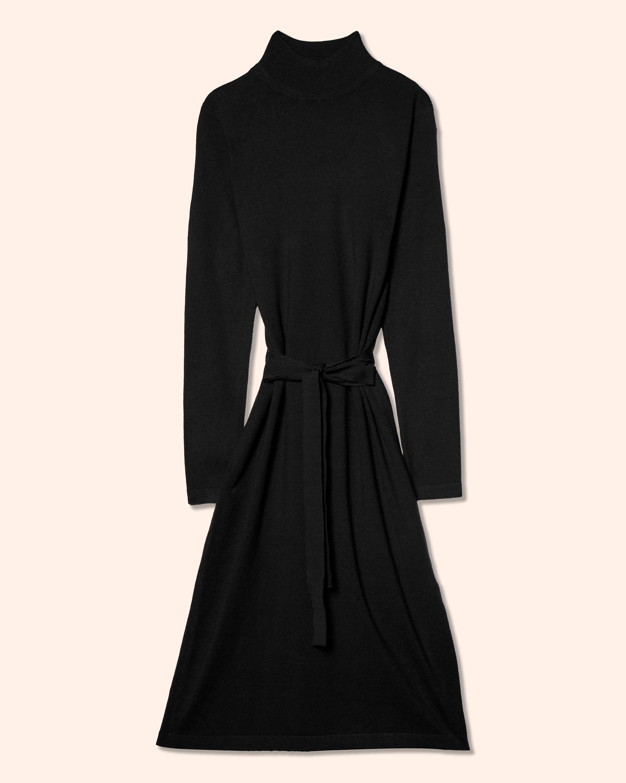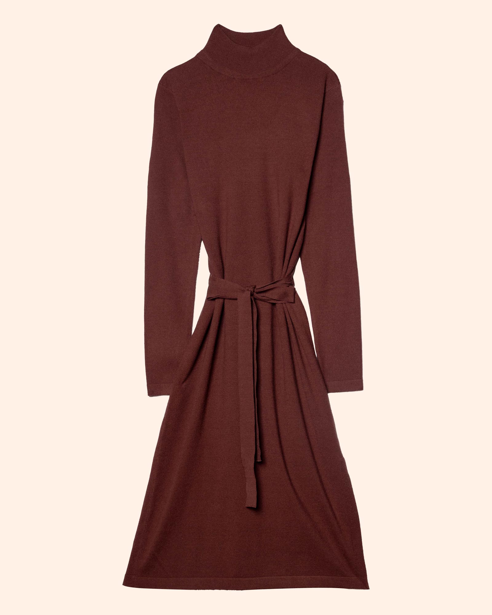 Vestido midi tejido manga larga, con cuello mock y cinturón tejido